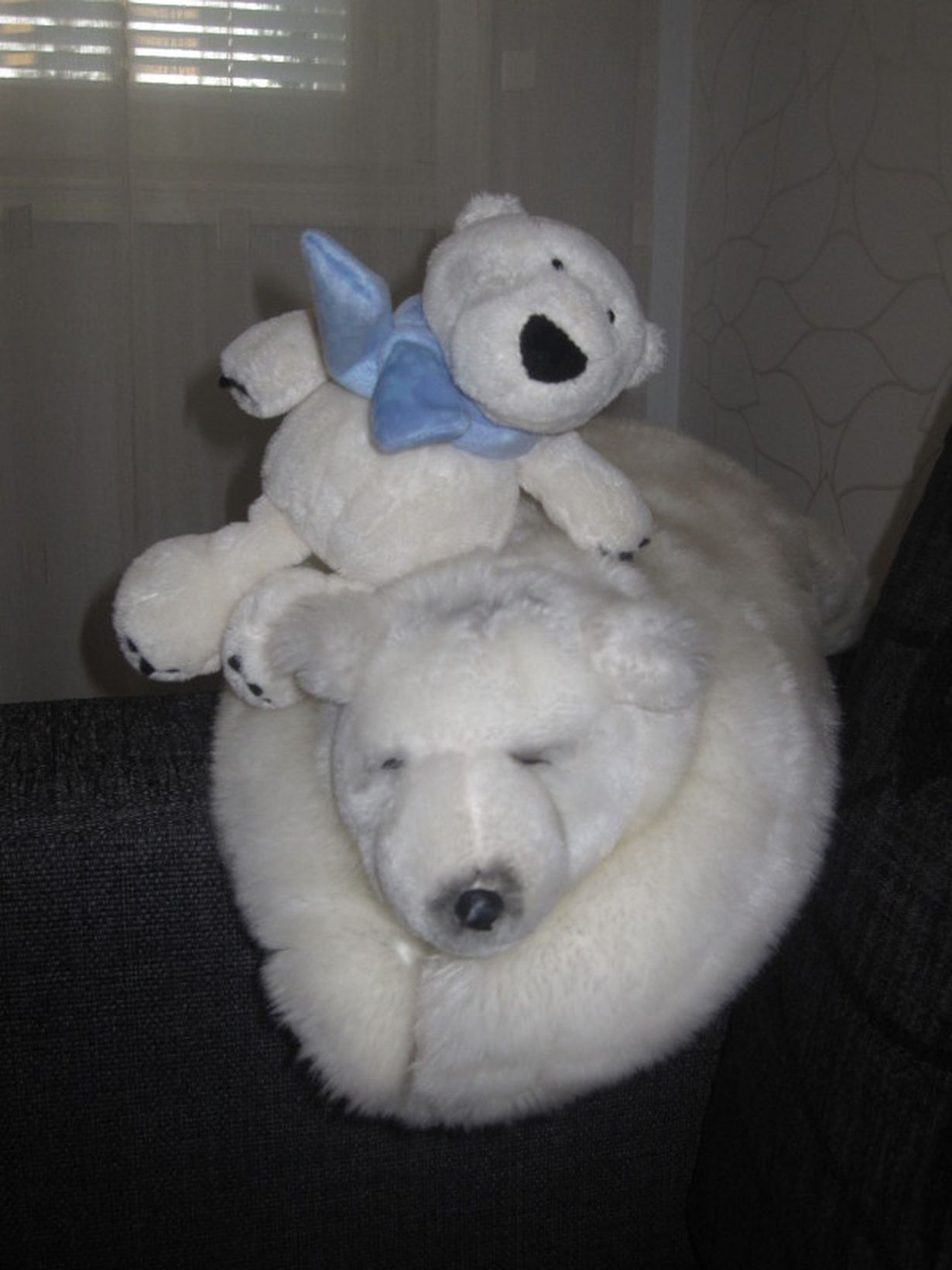 Nämä kaksi jääkarhua, iso ja pieni, olen jostain syystä heltynyt ostamaan itselleni. Ne makoilevat sängyllä. Toisinaan pikku tyttömme käy halailemassa tuota pehmeää ja isoa jääkarhua.