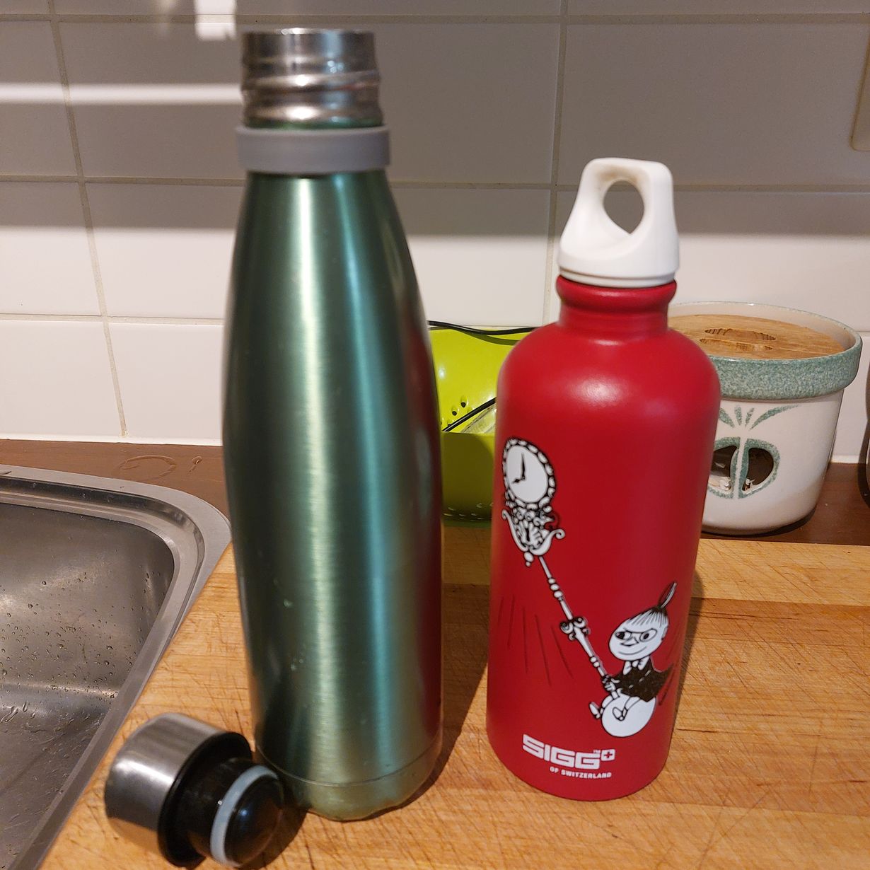 Tärkeät kumppanit jumppatunneilla, retkillä ja automatkalla. Vihreä pitää kylmänä/ kuumana lähes vrk. Punaisen sai lahjaksi