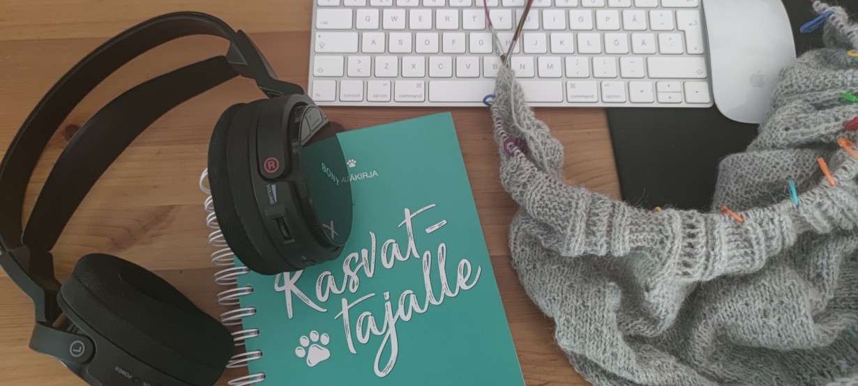 Tässä kuvassa on oikeastaan kaikki rakkaimmat harrastukseni. Kutominen, koiran kasvatus, musiikin kuuntelu ja tietokone (ohjeita, videoita,lukemista,opiskelua) 😍
