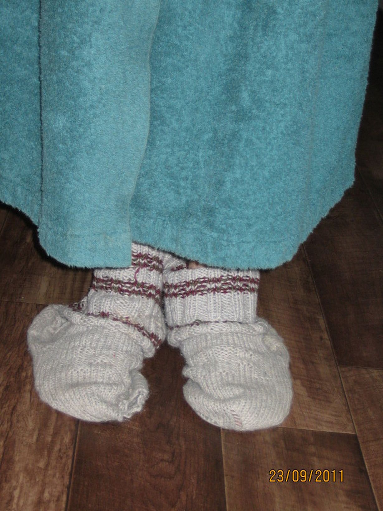 Tein miehelleni joskus 10 vuotta sitten nämä sukat, jotka olivat jo alkujaankin liian isot. Niistä tuli kuitenkin hänen rakkaimmat sukkansa, joita on, kuvastakin huomaten, käytetty paljon. Jalassa ne eivät meinaa pysyä, mutta jalkoja lattiaa pitkin laahamalla ne pysyvät mukana.