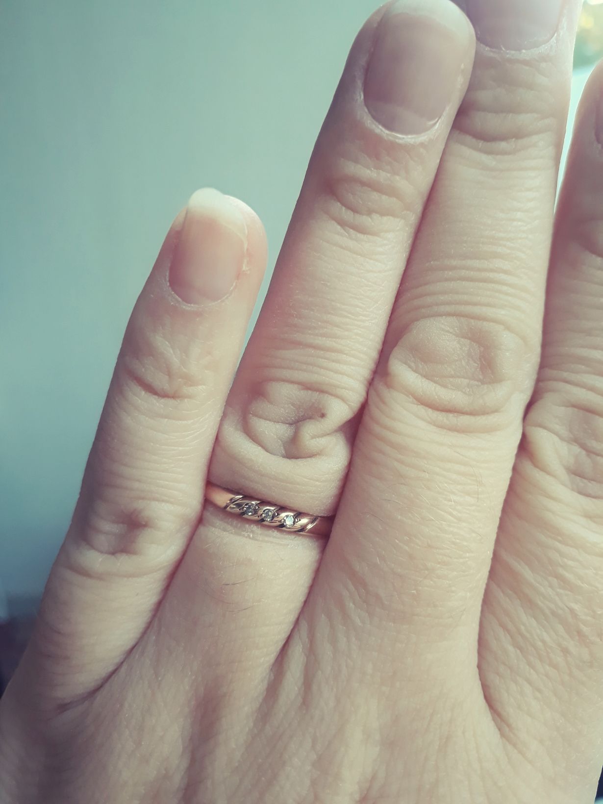 Kuvassa vihkisormukseni, äitini vanha. Äitini antoi sormuksen minulle joku aika sen jälkeen, kun vanhempani olivat eronneet. Päätin silloin, että jos joskus menen naimisiin, se on vihkisormukseni. Vaikka yleensä pidän pelkkiä hopeakoruja, tässä kohtaa tein poikkeuksen. En pidä liiasta blingblingistä, joten siinäkin mielessä sormus sopii minulle täydellisesti. Kihlasormukseni on hopeaa, mutta hyvin ovat hopea ja kulta kohta neljä vuotta sopineet yhteen.