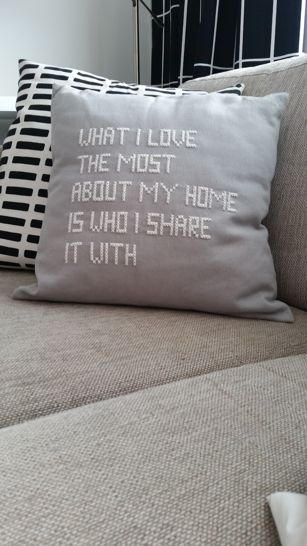 Kirjailin tämän tyynyn miehelleni vuosi sitten, kun ostimme ensimmäisen yhteisen asuntomme. Tyyny muistuttaa siitä, että elämässä tärkeintä ovat ihmiset, joiden kanssa saamme olla.