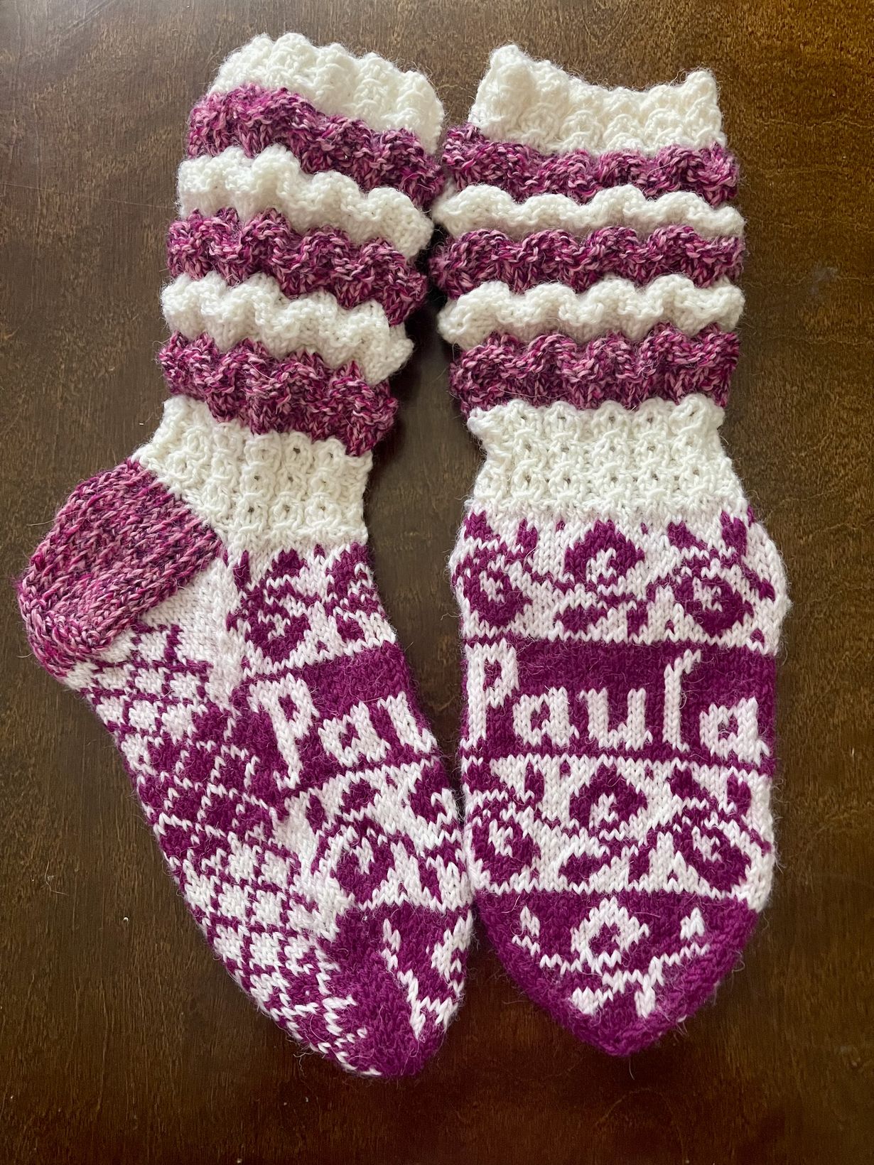 Äitini täytti hiljattain 90 vuotta, ja lämminhenkisillä kutsuilla lausuttiin runoja, laulettiin karaokea ja muisteltiin lapsuutta ja nuoruutta ainoan vielä elossa olevan, 93-vuotiaan siskon kanssa. Lahjaksi äiti sai rakkaudella suunnittelemani ja neulomani nimikkosukat. Hyödynsin niihin Fair Isle -kuviota hieman muokattuna, wellenmuster-neulosta sekä valepalmikkoa.