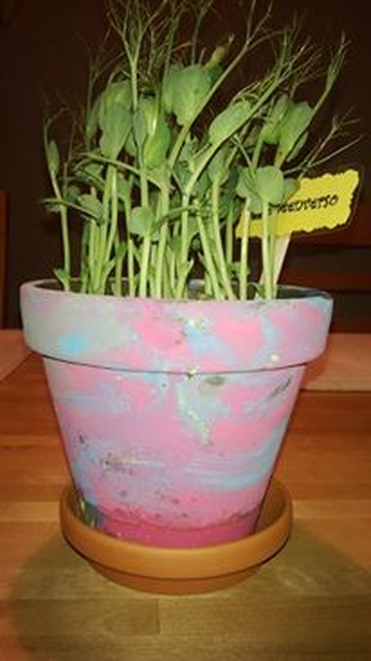 Ruukku on pienemmän poikani tekemä, hellyyttävä, omin pienen kätösin maalaama ruukku, johon hän aluksi istutti herneenversoja. Sainruukun istutuksineen hänelä lahjaksi pai vuotta sitten.
