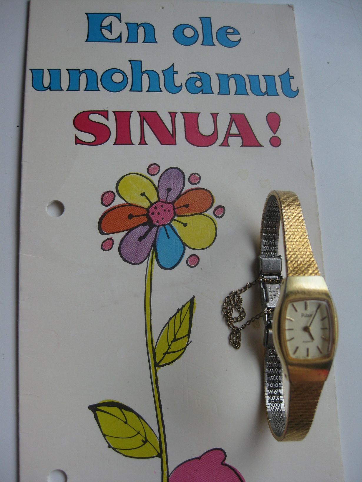 Sain tämän Pulsar-merkkisen rannekellon 1983 nyt jo poismenneeltä miesystävältäni.Sain sen myöhästyneenä syntymäpäivälahjaksi ja kortissa luki "En ole unohtanut sinua,vain sinun syntymäpäiväsi".Kellosta on nuppi rikki,mutta säilytän kellon ja kortin muistona.