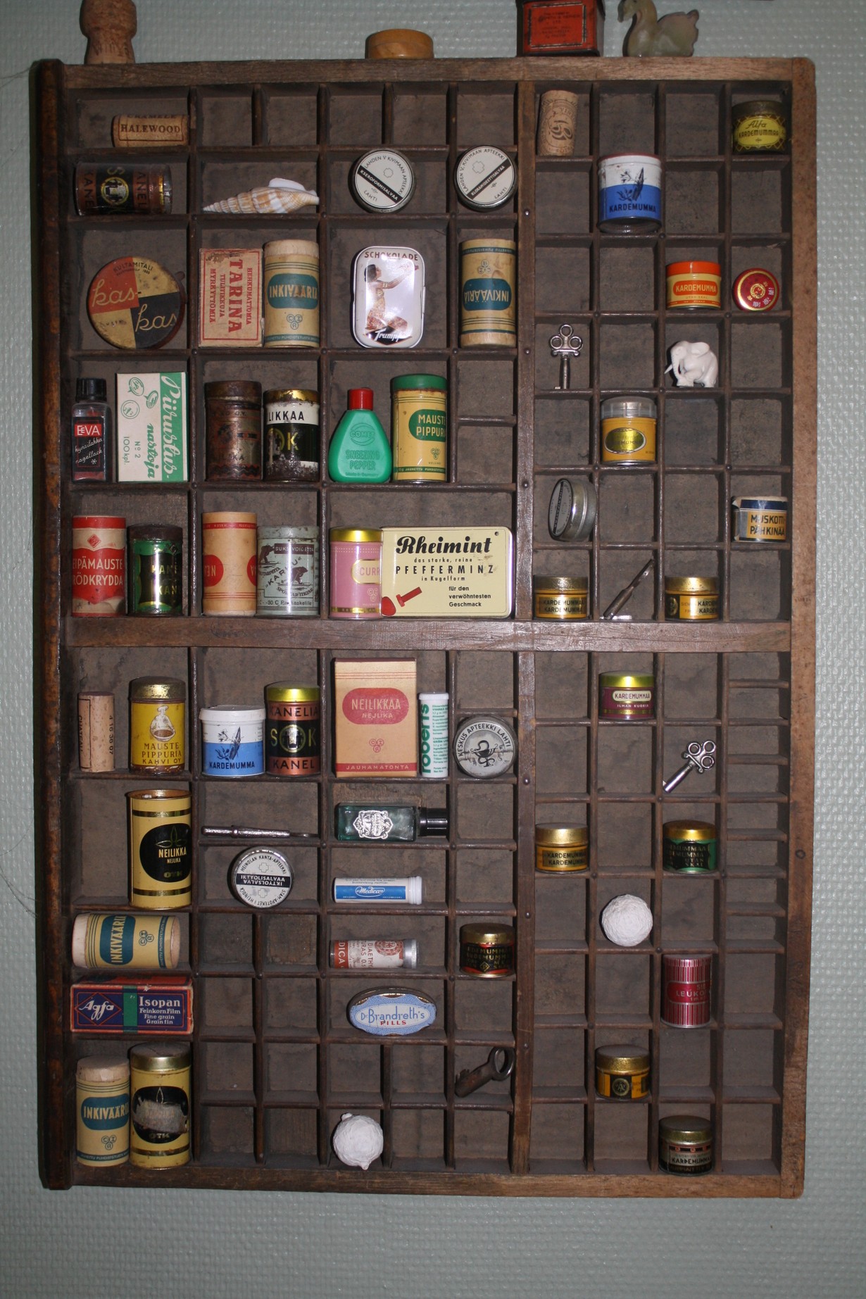 Ranskalainen kirjapainon kasti mahtui juuri ja juuri matkalaukkuun. Siitä tuli keittiön seinälle vahnojen maustepurkkien ja pienesineiden kantava voima.