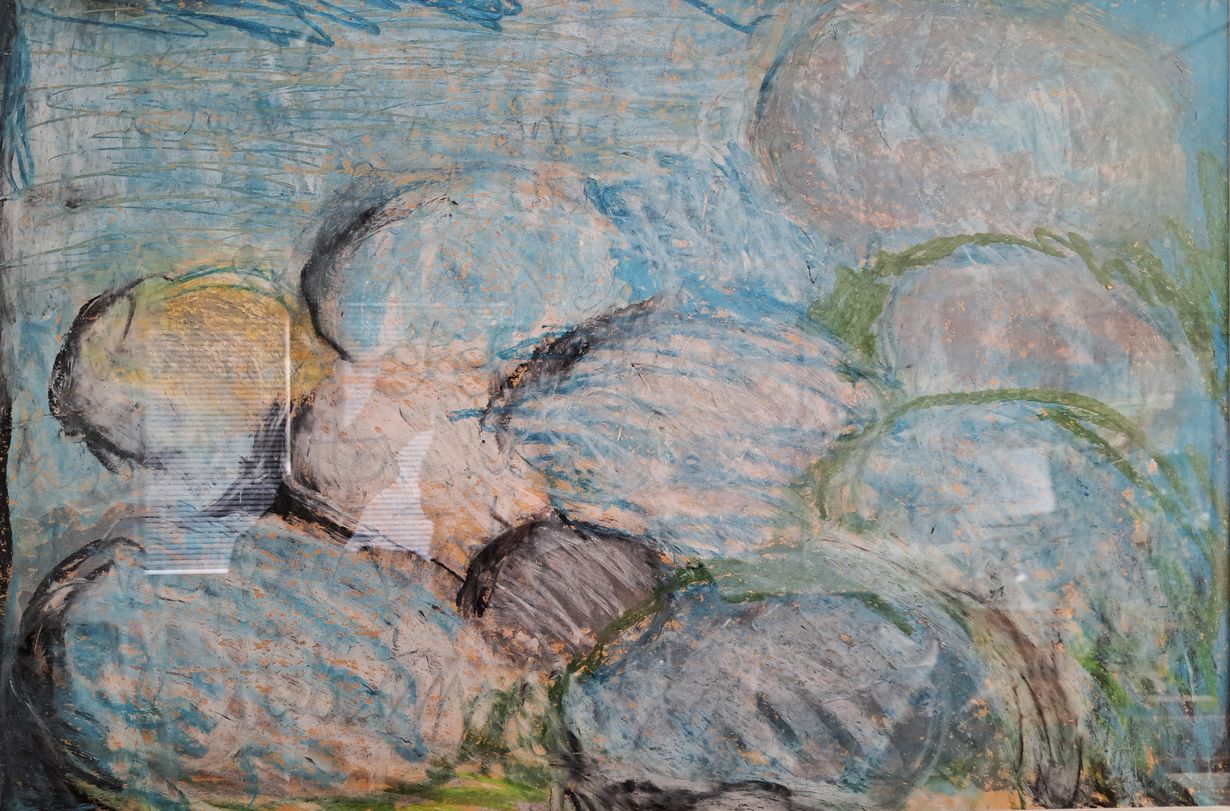Maalasin Rantakivet-työn kauan sitten ja kirjoitin päälle tekstin, joka vuosien myötä katosi kivien väreihin. Omista töistäni ainut, joka on kotini seinällä.