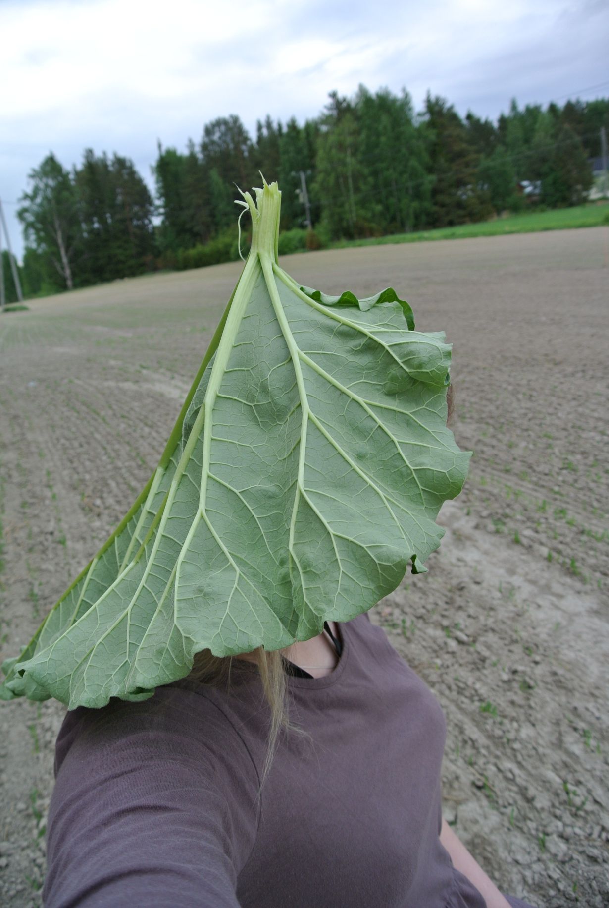 Auringonvalon alkaessa ahdistamaan pitkän ulkonatyöskentelyn kuluessa, on muhkeasta raparperipuskasta repäisty luomusuoja pelastanut monelta "päivänlallatukselta".