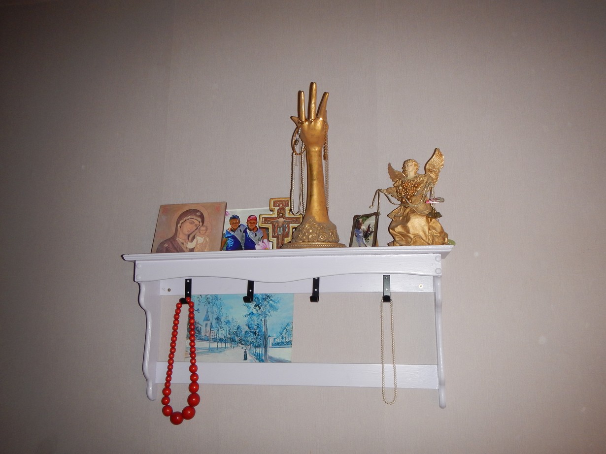 Hyllyssäni "taulu" Valamon luostarista, posliininen risti Assisista, pari rakasta valokuvaa, tyttäreltä saatu "kultainen" käsi korutelineenä ja jäljennös suosikkimaalauksista, sinertävä, rauhoittava. Enkelin historiaa muista. Usein käyttämäni helmet on helppo löytää naulakosta.