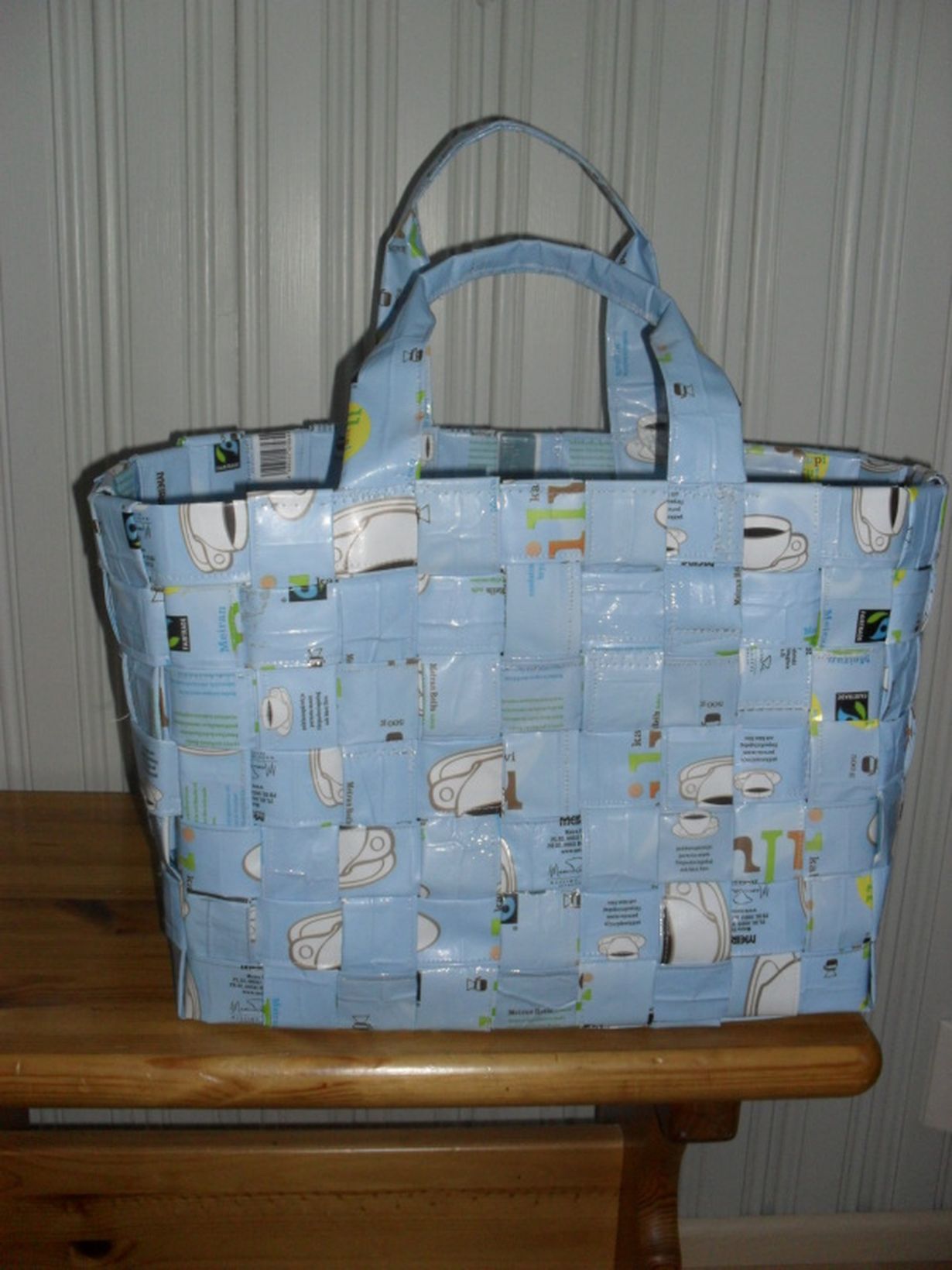 Tämä ihana arki: laukku reilun kaupan kassi 5.3.2012 klo 16:35 Olen kerännyt näitä sinisiä kahvipusseja ja niistä punonut laukkuja. Tämän yhden olen säästänyt itselleni. Se on hyvin rakas minulle.