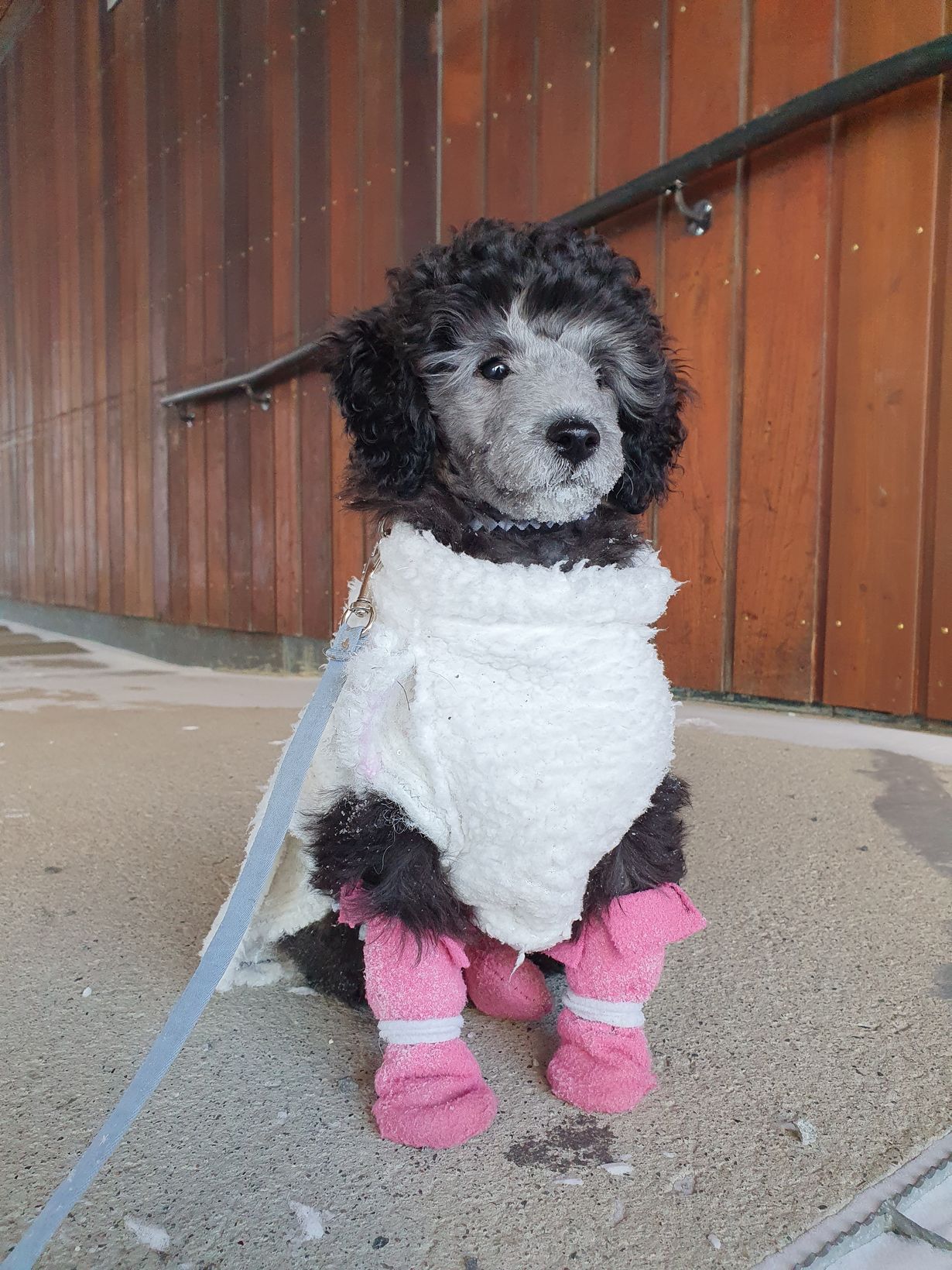 Tammikuu, -30°C ja kääpiövillakoiran pentu Reino tarvitsi vaatteet. Ompelutaitojen puutteesta huolimatta laitoimme Singerin sauhuamaan ja lopputuloksena syntyivät tossut vanhasta fleecehuovasta sekä kaksi takkia alennuskorin villapiposta ja naisten pörröpaidan hihasta.