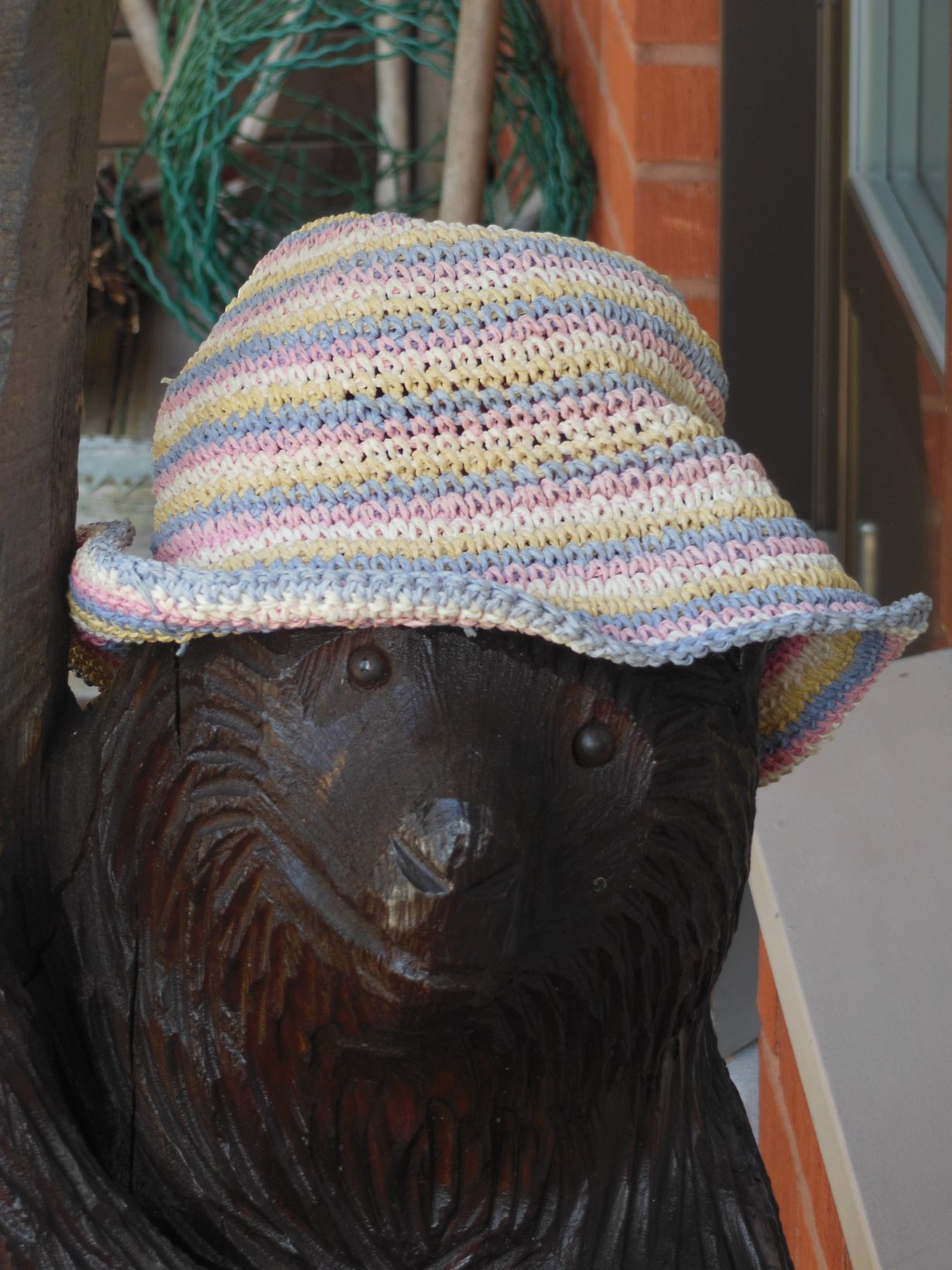 Helmi-ystävän paperinarusta virkkaama hellehattu on ihanan vilpoisa.