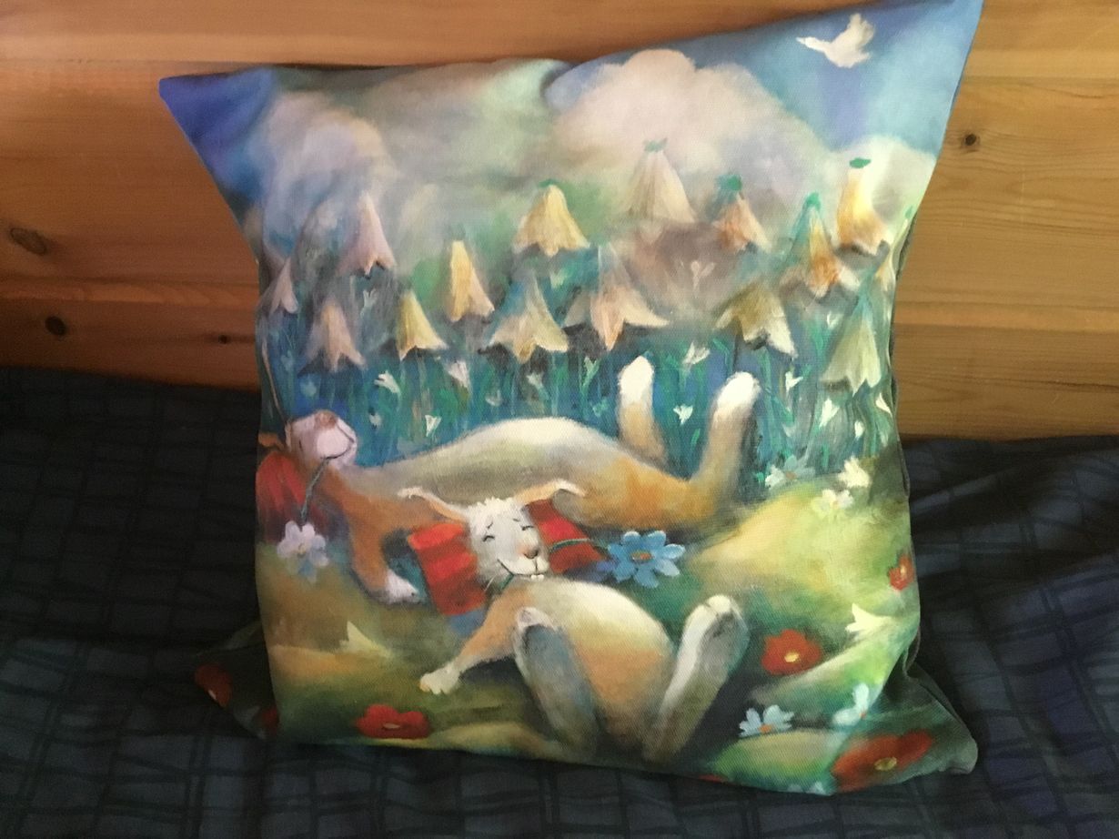 Tänä kesänä ihanasta taulusta oli tehty tyynynpäällinen. Nyt nautin Nokkalan taiteesta sohvallani.