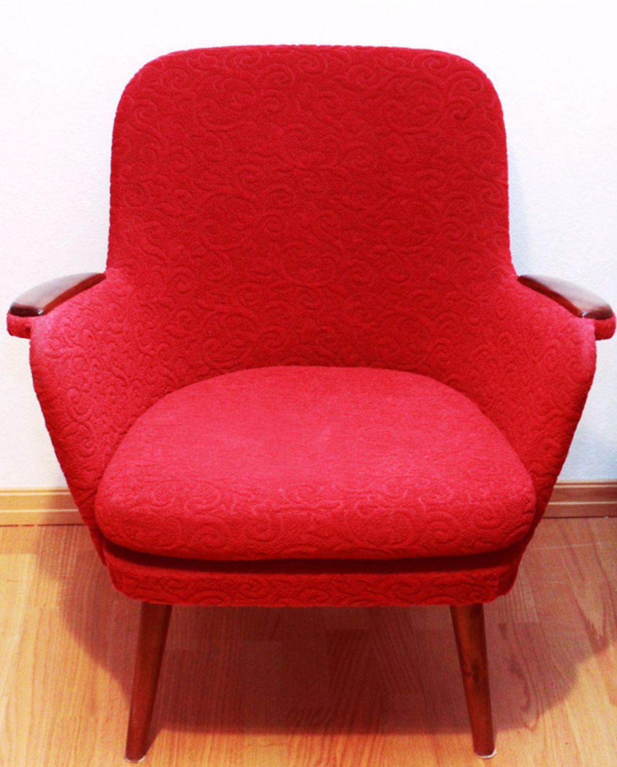 Sain nojatuolin perintönä ja ihastuin heti siihen. Nojatuolin on vanha ja siinä on alkuperäisverhoilu. Kankaan kuvio on erikoinen ja tuoli on upean värinen.