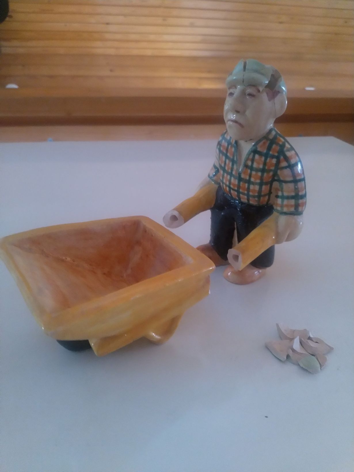 Isoisältä peritty Kupittaan Saven Kottikärryjä työntävä Ukko. Esine on minulle tärkeä, Ukko muistuttaa niin omaa pappaani pihamaallaanTurussa.