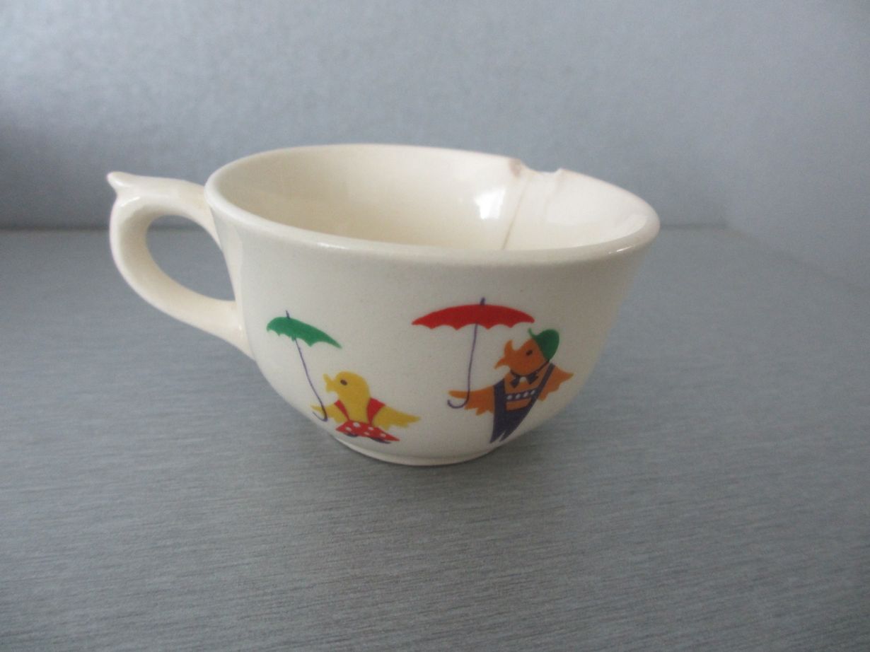 Lasten astiastosta jäljellä oleva kahvikuppi 1960-luvulta. Kupissa on halkeama ja palakin puuttuu. Siitä huolimatta on keittiössä näkyvällä paikalla koristeena.