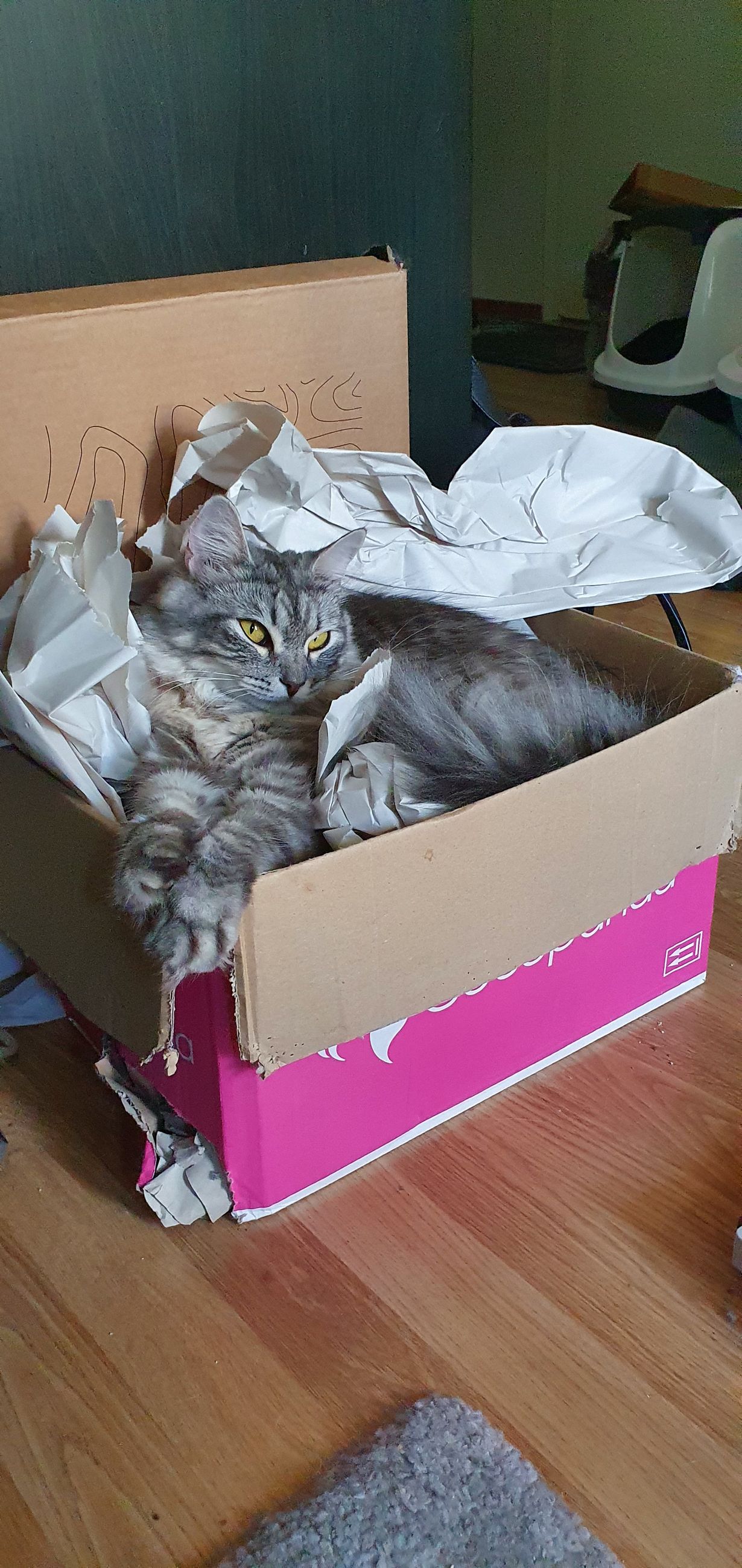 Kuvassa on vuosia vanha rikkinäinen pahvilaatikko, jossa on paperiroskaa. Se on silti kissalleni rakkain pesä, jossa on nukuttu pienestä pitäen monet yöt ja leikitty vaikka kuinka paljon. Aina, kun tekisi mieli heittää laatikko roskineen päivineen menenään, kissa menee makoilemaan siihen päälle kuin sanoakseen: " Tämä on minun pesäni, ei sitä saa viedä pois."