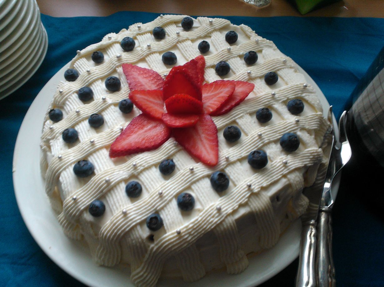 Vietimme poikani rippijuhlia ja hän toivoi tavallista kakkua, ilman sokerimassaa tehdyn. Niimpä käytin koristeluun vaniljakermaa, tuoreita mansikoita, mustikoita ja hopeakuulia. Kakku sai paljon kehuja ja itsekin olin lopputulokseen tyytyväinen.
