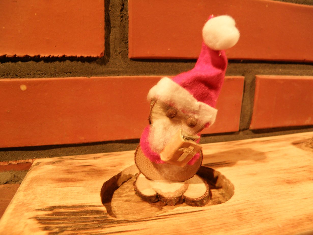 Tontut ovat jätemateriaalista tehtyjä. 'Riparitontulla' on 3 erikokoista puukiekkoa liimattuna yhteen vartaloksi, ja kädessä oleva kirja on tehty tuohenpalasta varustettuna folio-ristillä. Poika sai tietenkin tontun omakseen.