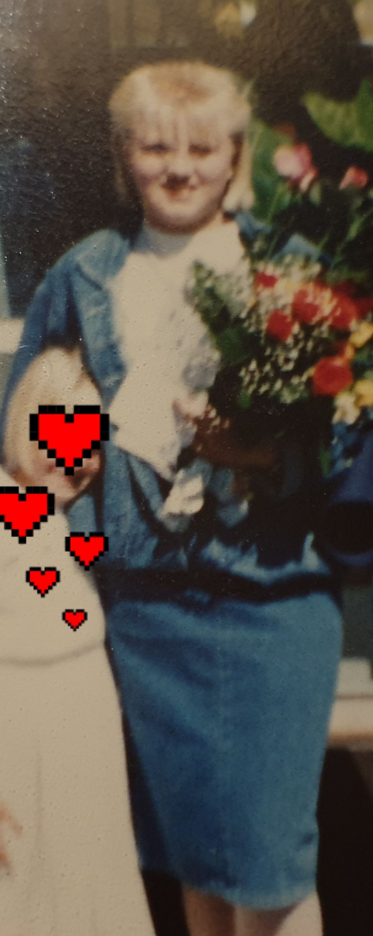 No, tässä olen siis 15-vuotias nuori. Pahimmat riidat äidin kanssa takana. Äiti on tässä kuvassa sisareni vieressä ja isäni minun vieressäni. Valitsin farkku-asun, koska meillä oli taloudellisesti tiukkaa tuolloin. Olin "outo". Muilla tytöillä oli hienoja mekkoja päällään. Kävin 1. kertaa kampaajalla valmistautuessani tuohon päivään...