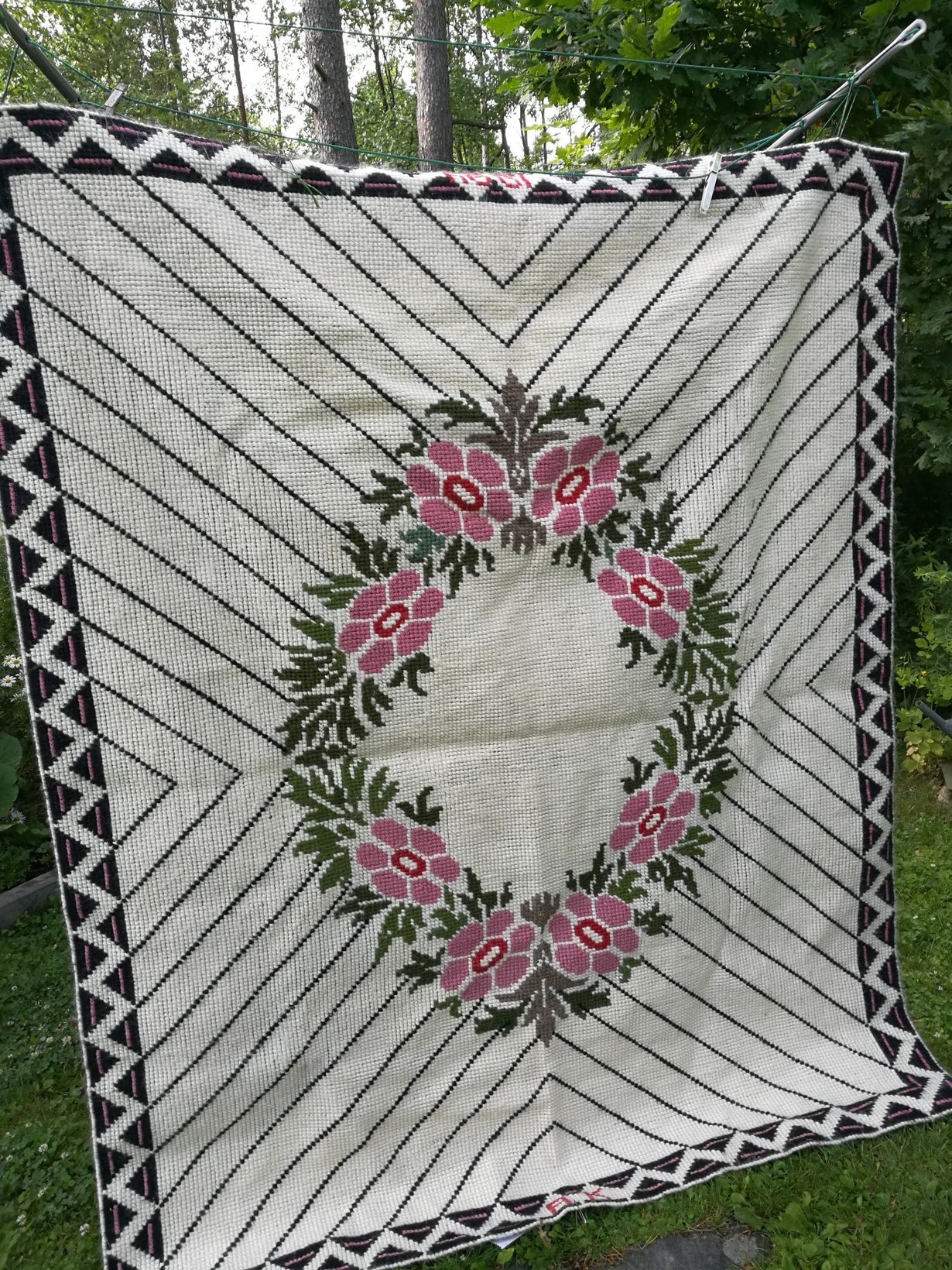 Suunnittelin ja toteutin itse kesällä 1994. Maton koko on 160 x 240 eli siinä tekemisessä kului muutama sadepäivä.