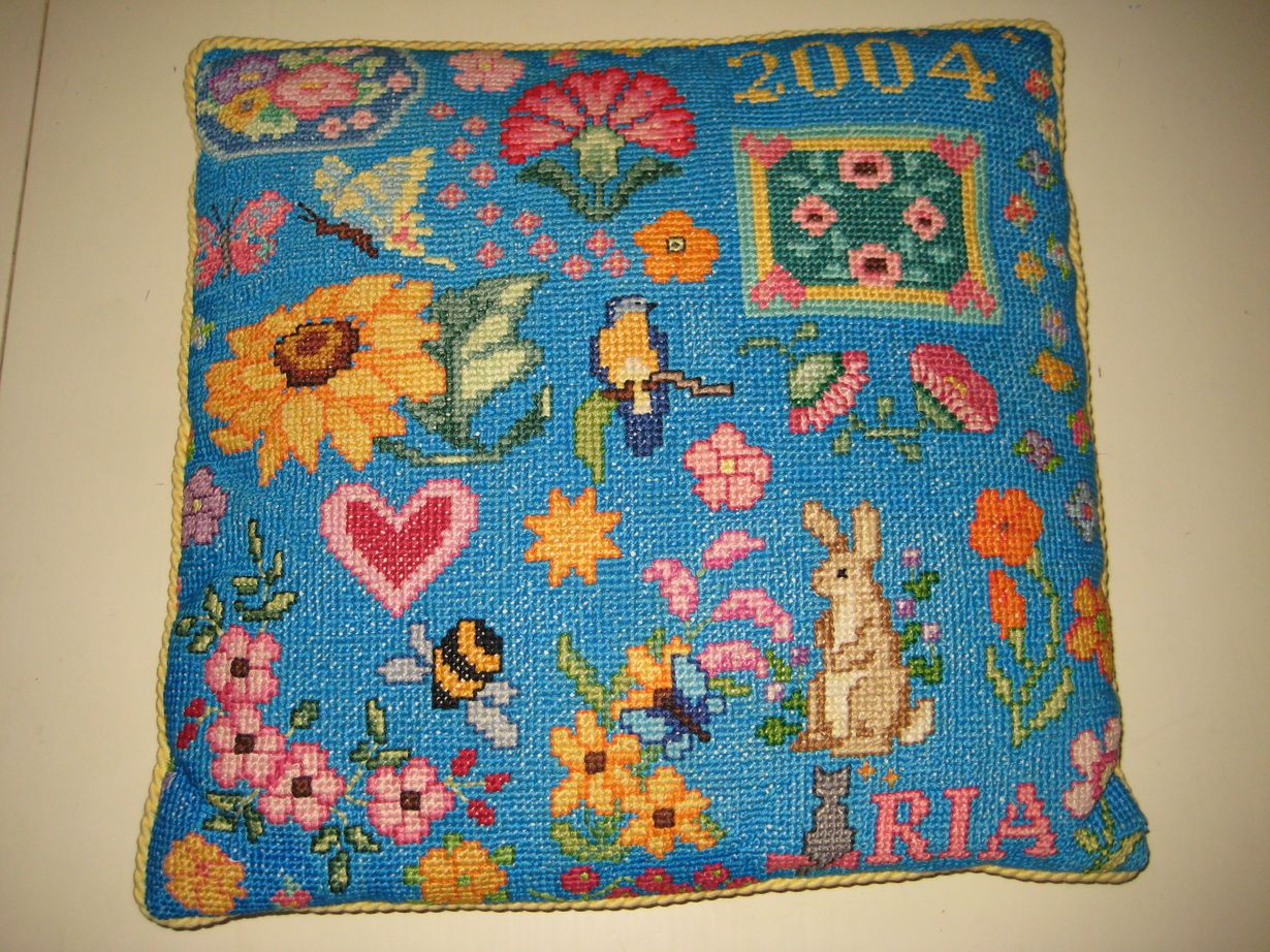Tähän tyynyyn meni vuosi ja 2.000 ristipistoa. Mutta sitä oli mukava tehdä TV:tä katsellessa.