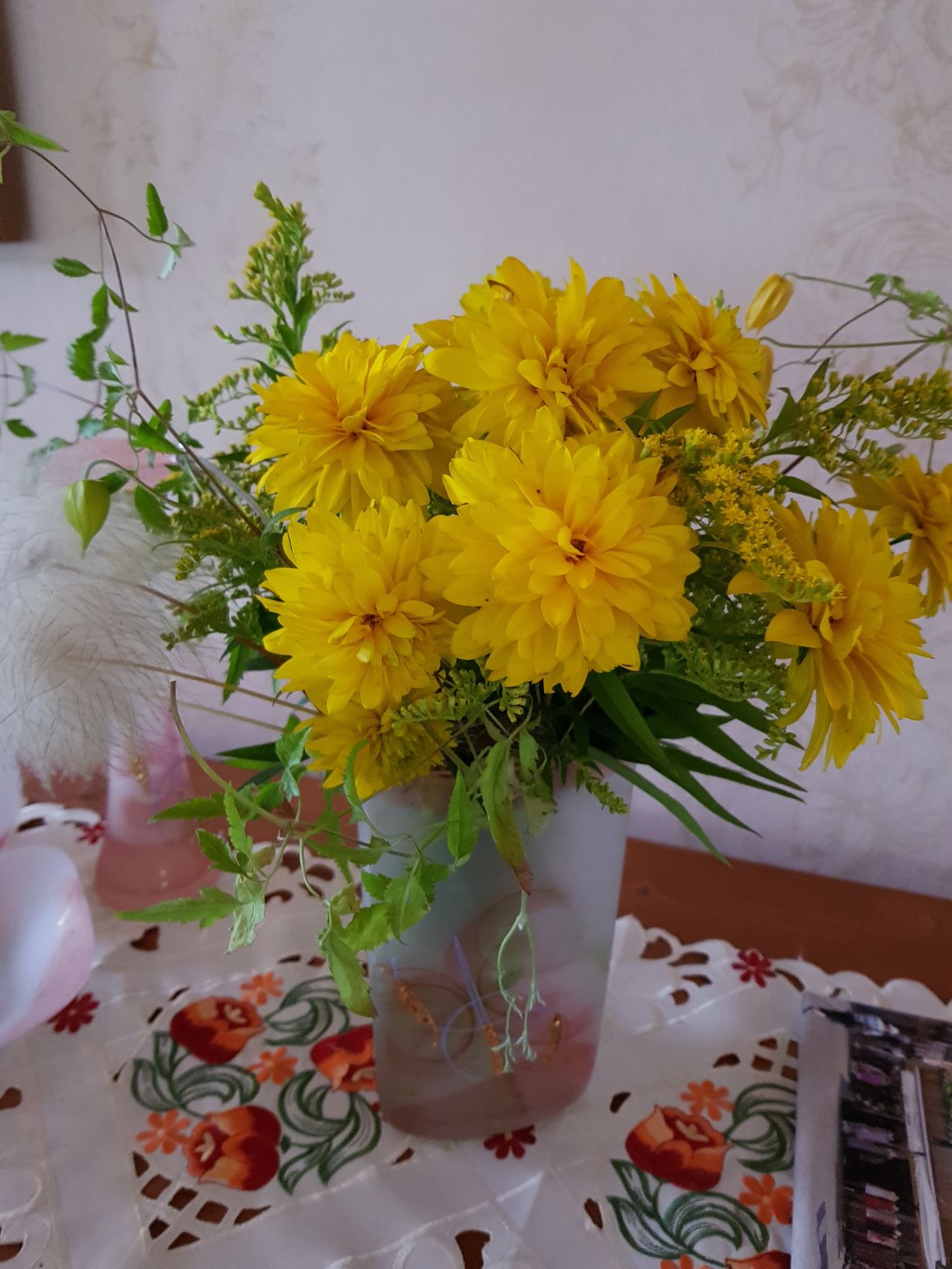 Tämän kauniin vaaleanpunaisen ja kultakoristellun maljakon toin äidilleni tuliaiseksi Romaniasta talvella 2009. Työskentelin tuon talven Bukarestissa EU-erityisasiantuntijana. Aina käydessäni kotona tervehtimässä vanhaa äitiäni, toin hänelle yhden astian ko. sarjaa, jonka nimeä en vieläkään tiedä. Ehkäpä joku voi auttaa. Viime kesänä sidoin siihen tämän kimpun kotipihani kultapalloista, kultapiiskuista sekä kärhöstä.