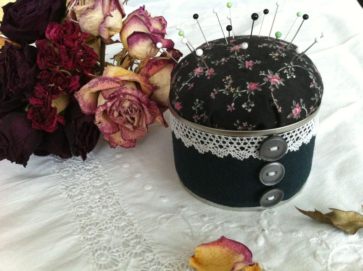 Romanttinen neulatyyny on syntymäpäivälahja tyttärelle. Olen tehnyt neulatyynyn kierrätysmateriaaleista. Kehikkona on säilykepurkki ja täytteenä äidiltä opitun vanhan niksin mukaan hiuksia, Neulat uppoavat täytteeseen ihanasti!