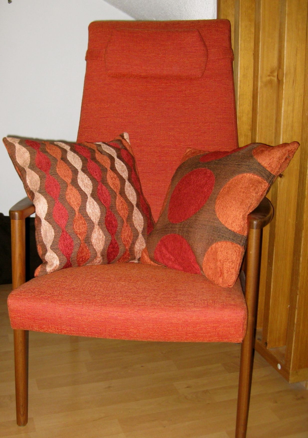 Löysin nojatuolin nelisen vuotta sitten HOAS:n roskalavalta. Se oli kaunis ja kulunut. Punaista päällistä oli kursittu kokoon punaisella villalangalla ja niskatyyny lötkötti venyneen kuminauhan varassa. Ihastun aina vanhohin, kuluneisiin löytötuoleihin ja haluan pelastaa ne arvoiseensa käyttöön. Pelastaisin useammankin vaan tilanpuutteen vuoksi olen joutunut luopumaan useasta istuttavasta ja ihanasta tuolista. Vein tuolin korjattavaksi ja se arvoisensa uuden oranssin päällisen ja muutama viikko sitten löysin tuoliin sopivat tyynyt, kuin tehdyt juuri tätä tuolia varten.