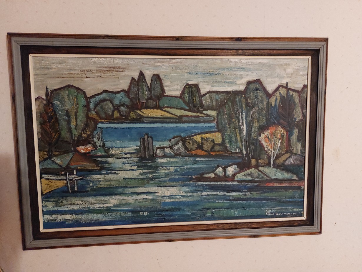 107cm x 72cm Toimi Backman 1964. Taulu tullut minulle perintönä Auli Litukalta Tampereelta. En tiedä taulun tarinaa kuinka on suvulle kulkeutunut. Ruma se on, mutta olen lapsesta saakka sitä mummolassa katsonut niin kiinnyin siihen kovasti. Se tuo mukavia muistoja mieleen ja nyt se onkin aina olohuoneessani hyvin näkyvällä paikalla