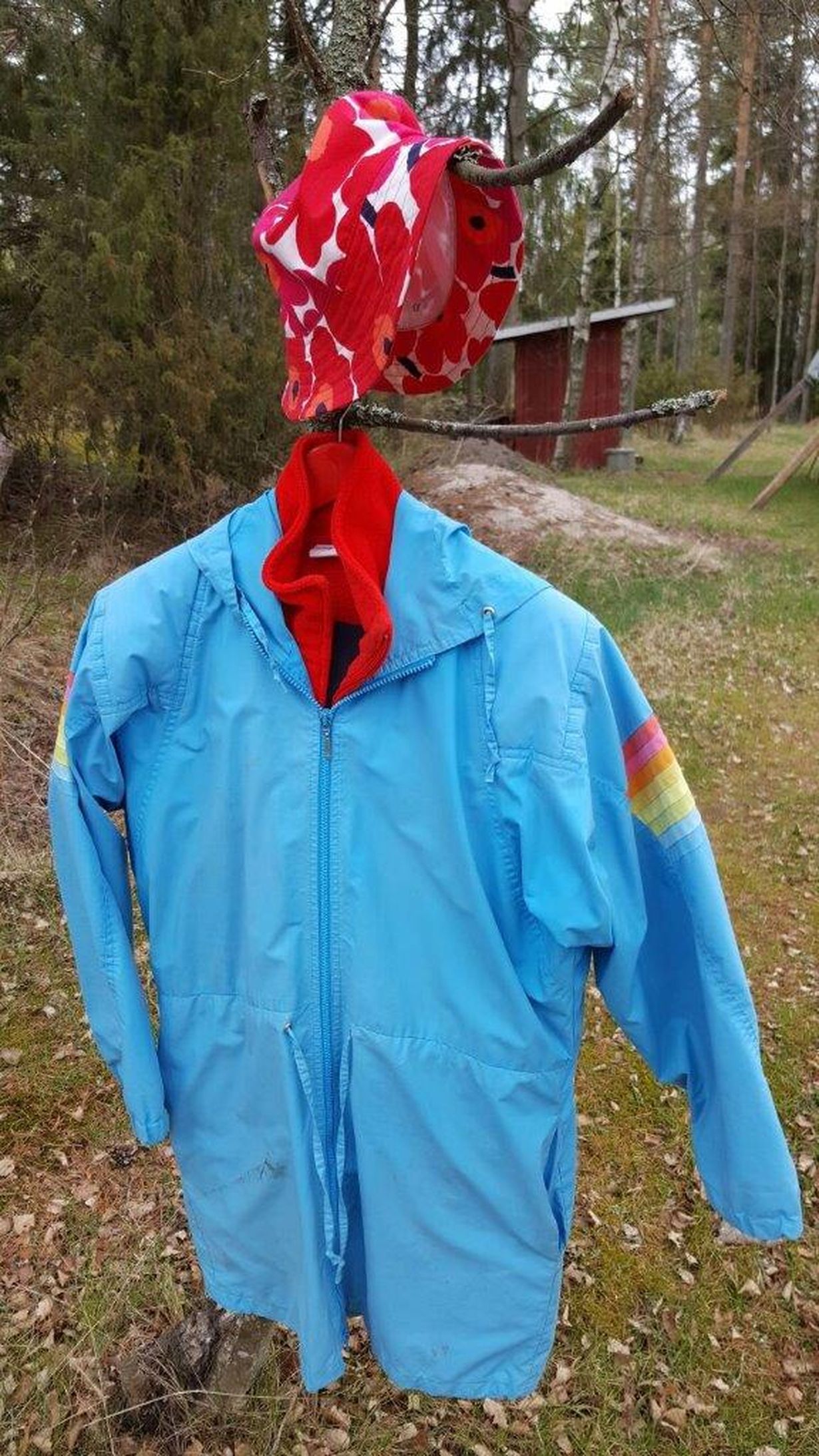 Tämä Torstain takki ja Marimekon lierihattu ovat vuodelta 1987. Asusteet ovat olleet jo yli 25 vuotta työvaatteina pihahommissa. Joka kevät ajattelen, että "tämä on viimeinen vuosi kun käytän näitä lumppuja, syksyllä poltan saunan pesässä". Mutta kun piha on haravoitu lehdistä ja saatu talvikuntoon, niin pesen vaatteet puhtaiksi odottamaan seuraavaa kevättä ja seuraavan vuoden pihahommia. Nyt käytän näitä vaatteita mökillä samoissa hommissa. Mieheni vihaa tätä takkia ja hattua yli kaiken.