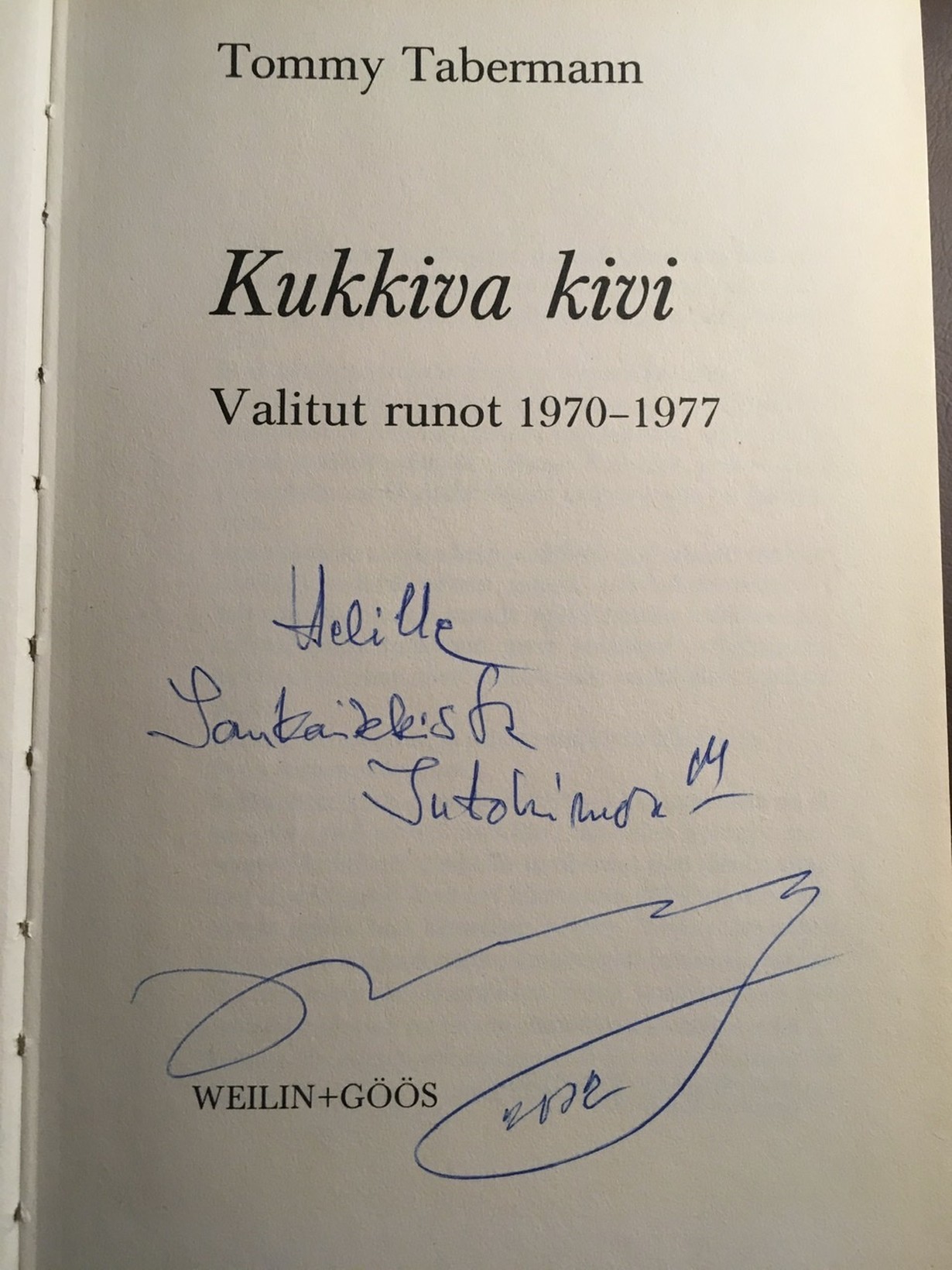 Minulla on ollut tämä runokirja vuosia ja sitä on nuoruudessa luettu ahkerasti. Vuonna 2002 kuullun työpaikan tyhyluennon jälkeen pyysin kirjaan kirjailijan nimikirjoituksen. Sen mukana tuli tyyliin sopiva toivotus - iänkaikkista intohimoa!