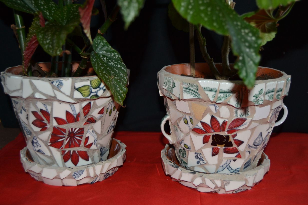 Olin lähdössä lapsenlapsen 19 v syntymäpäiville. Pakkasin lahjaksi ostamani Arabian Runo sarjan kolme lautasta lahjakassiin. Kuinka ollakkaan kassin pohja petti liimauksistaan ja lautaset tippuivat lattialle ja yksi kolmesta jäi vain ehjäksi. Kyllä vähän suretti, mutta myöhemmin keksin tehdä sirpaleista nämä mosaiikkiruukut. Taitaa toisessa ruukussa olla toistakin särkynyttä sarjaa, mistä nuo rivatkin ovat.