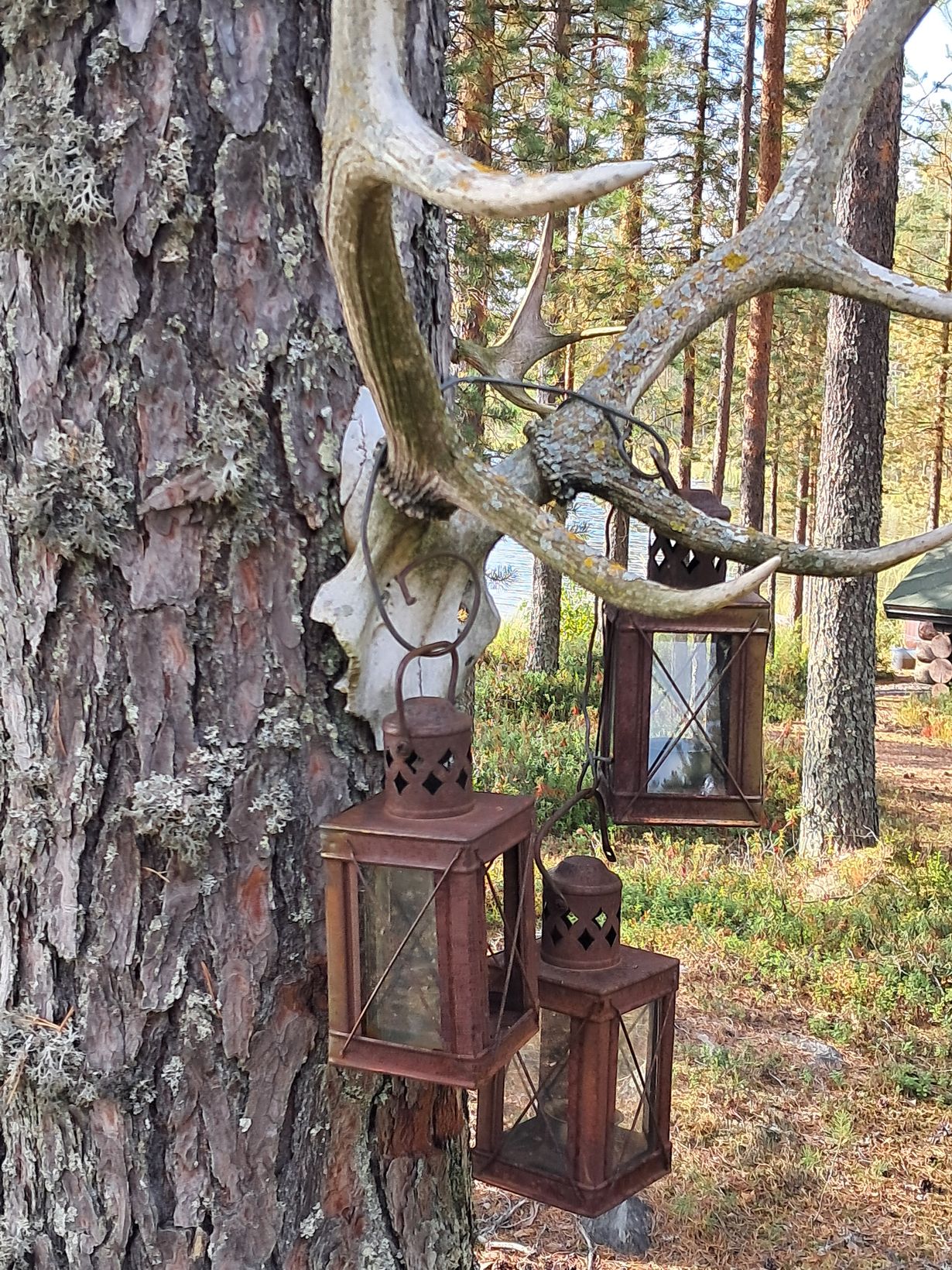 Lähetä kuvakisaan kuva pihalyhdystäsi - voita Lapuan Kankureiden villahuopa Ruosteisia lyhtyjä Mummeli 7.9.2025 klo 16:04 Kesämökillä kolme ruosteista lyhtyä hirvensarvissa. Sarvet kiinnitetty mäntyyn.