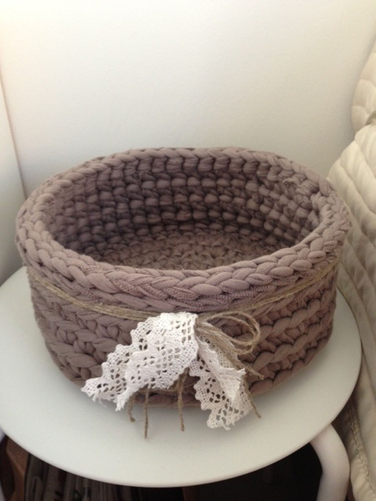 Olen innostunut virkkaamaan erityisesti mattoja ja erilaisia koreja. Tämä on yksi aikaansaannokseni ja päätyi tyttärelle tupaantuliaislahjaksi uuteen kotiin. Rusetti on kaivettu oman kaapin kätköistä ja antaa korille mukavan ilmeen.