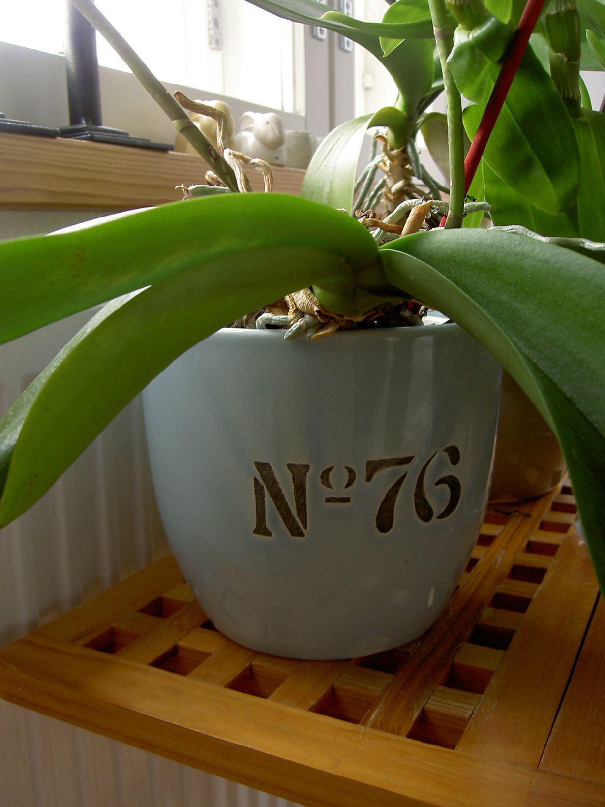 Vanhin orkidea kasvoi ulos lasiruukustaan ja sille tarvittiin uusi, mutta kivaa ja käytännöllistä ei vaan löytynyt. Niinpä se istutettiin käytännölliseen, joka puolestaan mahtuu kivaan suojaruukuun. Orkidean saa nostettua sieltä helposti viikottaiseen liotukseen.
