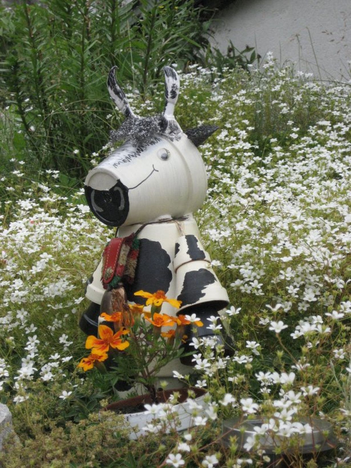 Hauskin näkemäni puutarhakoriste oli veikeä. Olimme vaellusmatkalla Svetsin Davosissa ja viimeisen päivän vaellus päätyi kylään, jonka pihassa näin ihanan "alppilehmän" kukkien keskellä. Kamera esiin ja kuvasin kohteen. Olimme juuri tehneet pitkän matkan alppirinnettä alas ja jalat olivat jo viikon vaelluksista hieman kankeat, mutta lehmän näkeminen oli päivän kohokohta. Itse olen yrittänyt tehdä oman version puutarhaani, mutta minun taitoni eivät ole toistaiseksi riittäneet siihen hommaan.