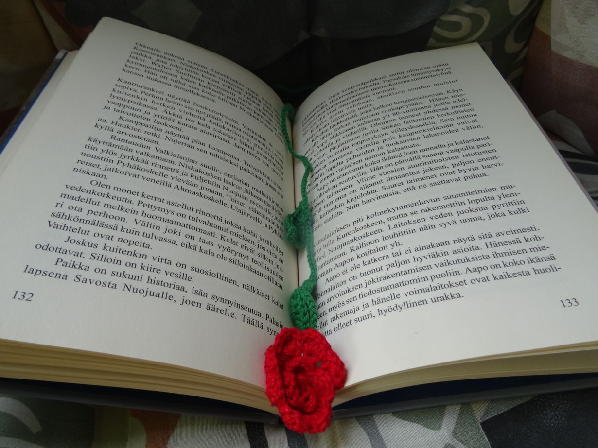 Kummitätini lahjoittama virkattu ruusukirjamerkki, hän lienee sen jostain myyjäisistä ostanut