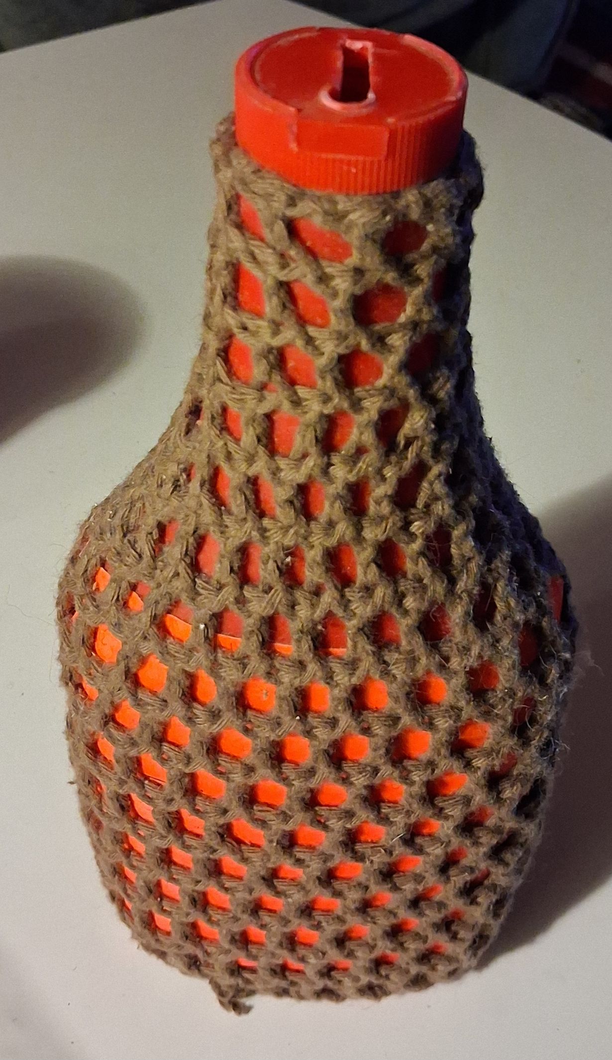 Tuunasin itselleni säästölippaan ketsuppipullosta. Korkkiin tein aukon kolikoita varten. Koska etiketti ei irronnut, liimasin päälle oranssin tarran. Virkkasin puuvillalangasta somisteeksi verkon. Ekolipas oli valmis!