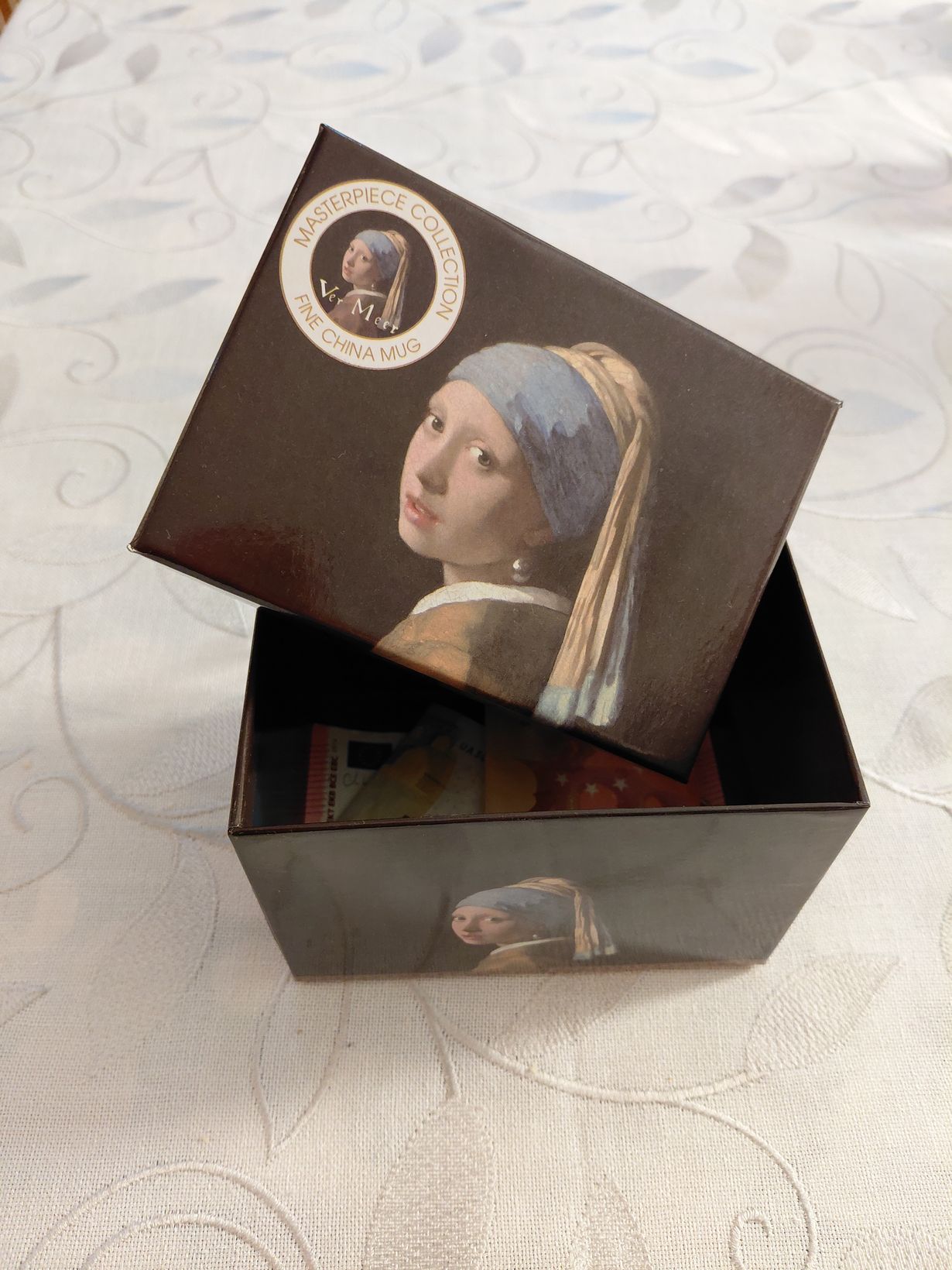 Sain kerran mieheltäni lahjaksi kauniin mukin, mikä oli tehty Johannes Vermeerin maalauksen pohjalta Tyttö ja helmikorvakoru. Muki oli kauniissa pahvikotelossa ja säästin sen itselleni säästölippaaksi! Siihen kerään kirpputorituotot seuraavaa lomamatkaa varten!