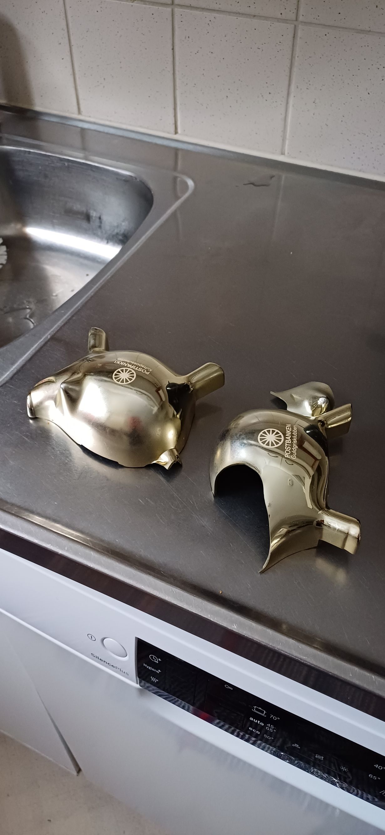 Kultainen Postipankin säästöpossu jota olen säilönyt kaapin ylähyllyllä. Ja NYT kaappia siivotessa juuri tämän piti pudota ja särkyä. Monikaan lautanen ei olisi harmittanut jos olisi särkynyt mutta tämä, lapseni säästöpossu.
