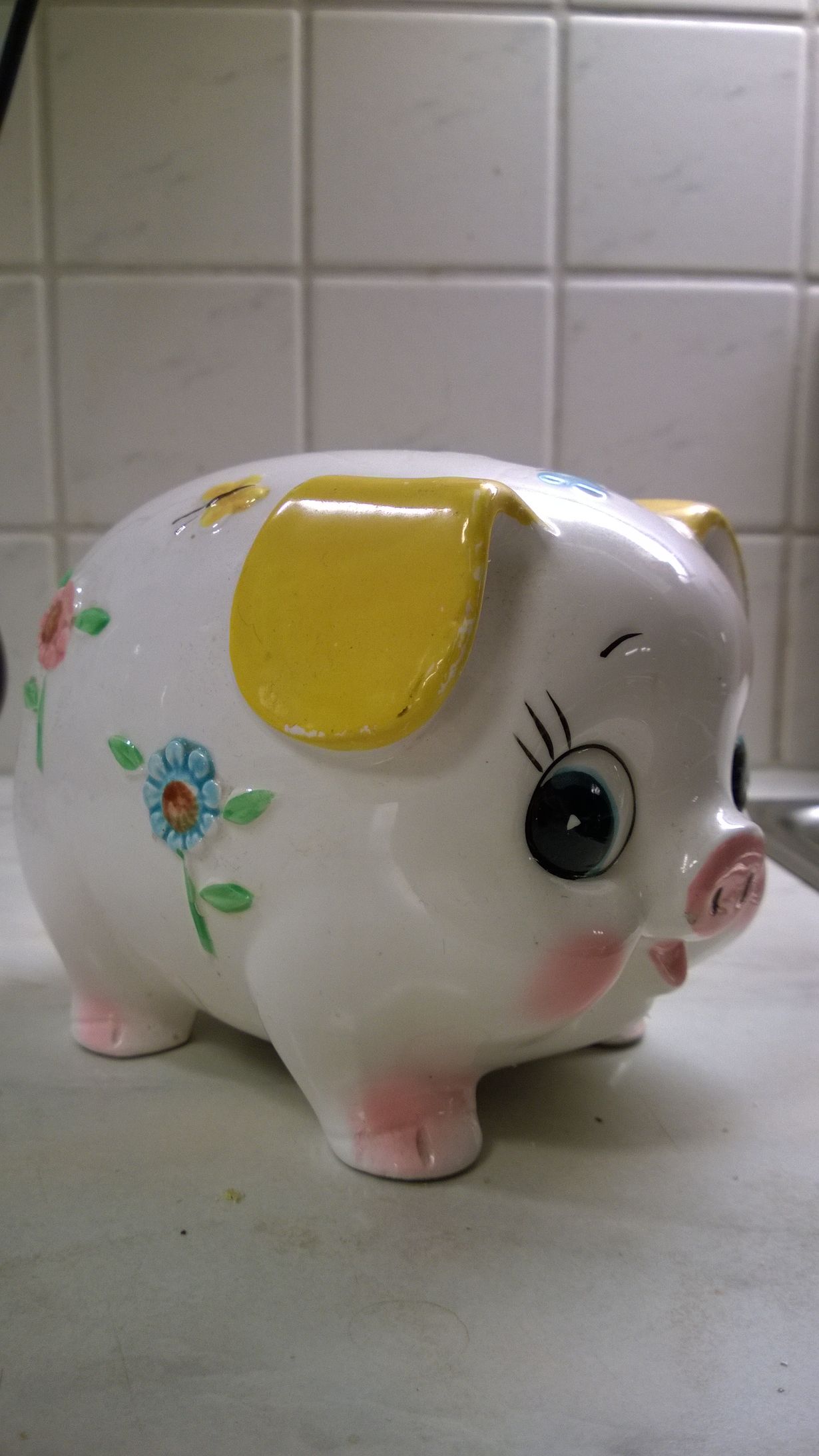 Tämä ihana säästöpossu on kummeiltani saatu joululahja noin 50 vuoden takaa. Se saapui postipakettina ja toivottajana oli Roihuvuoren pukki.
