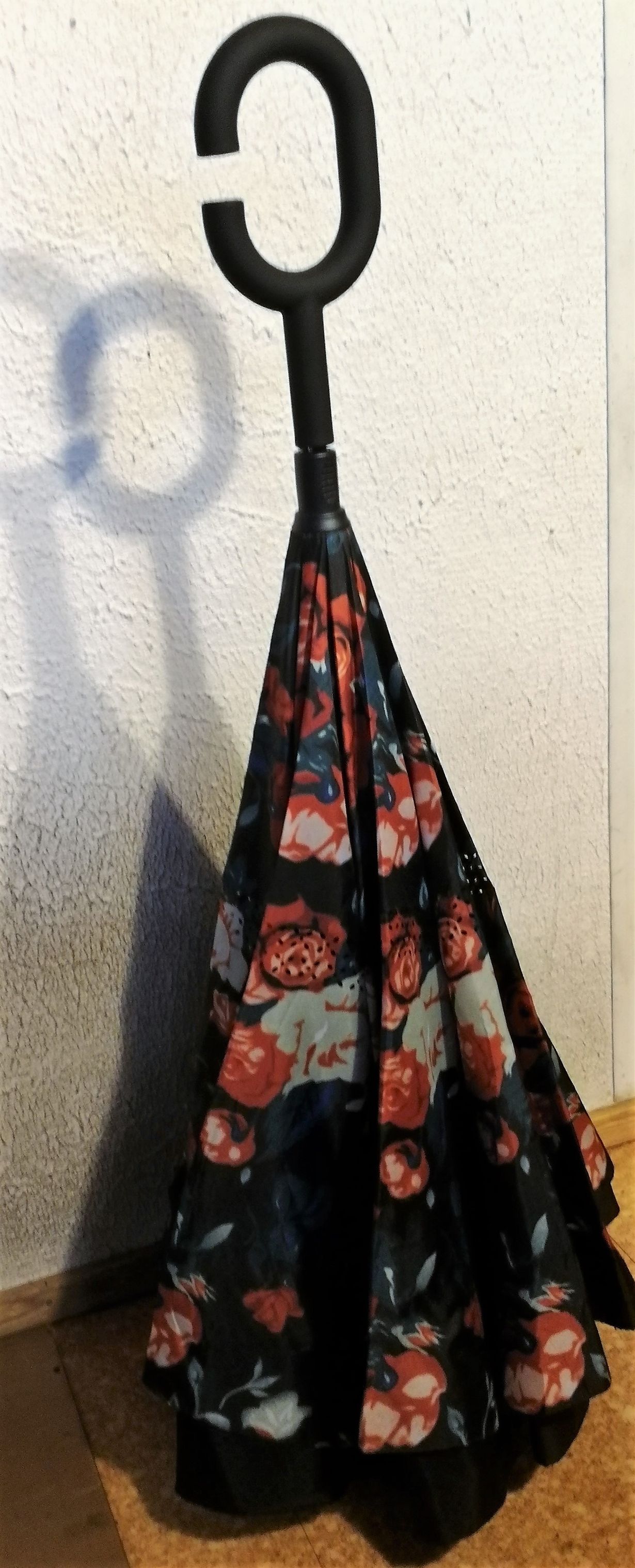 Ihana sateenvarjoni on aina päältä kuiva, koska märkä puoli jää sisälle. Se seisoo lattialla. Molemmat kädet pysyvät vapaina suuren lenkin/kahvan ansiosta.