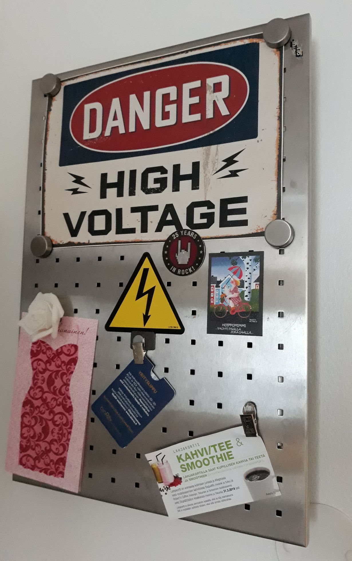 Sähköasentajamies naamioi keittiössä olevan sähkökaapin magneettimuistitauluksi. Oikein kätevä, kun sijaitsee "pääväylän" varrellakin.