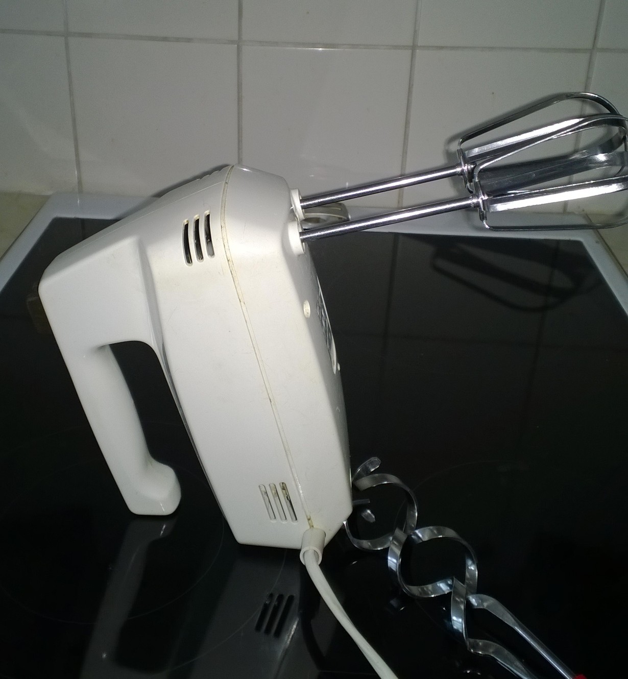 Häälahjaksi v. 1976. Viitisen vuotta sitten oli lopettamaisillaan toiminnan, mutta tee-se-itse-sähkömieheni tutki sen sisukset ja vaihtoi yhden kondensaattorin. Sen jälkeen on taas tehty taikinat, muussit ja vispipuurot.