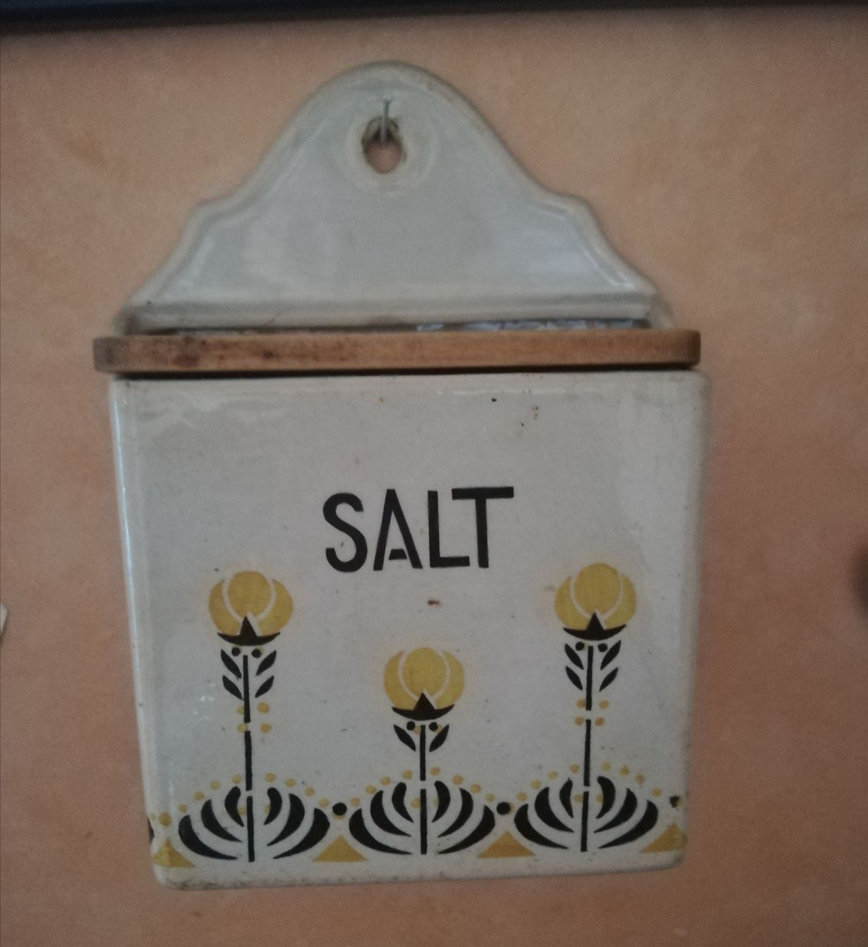 Ostettu tukholmalaiselta kirpparilta, joten tarina ei ole tiedossa. Rakastan retroa, eli nappilöytö vanhan talon keittiön seinälle.