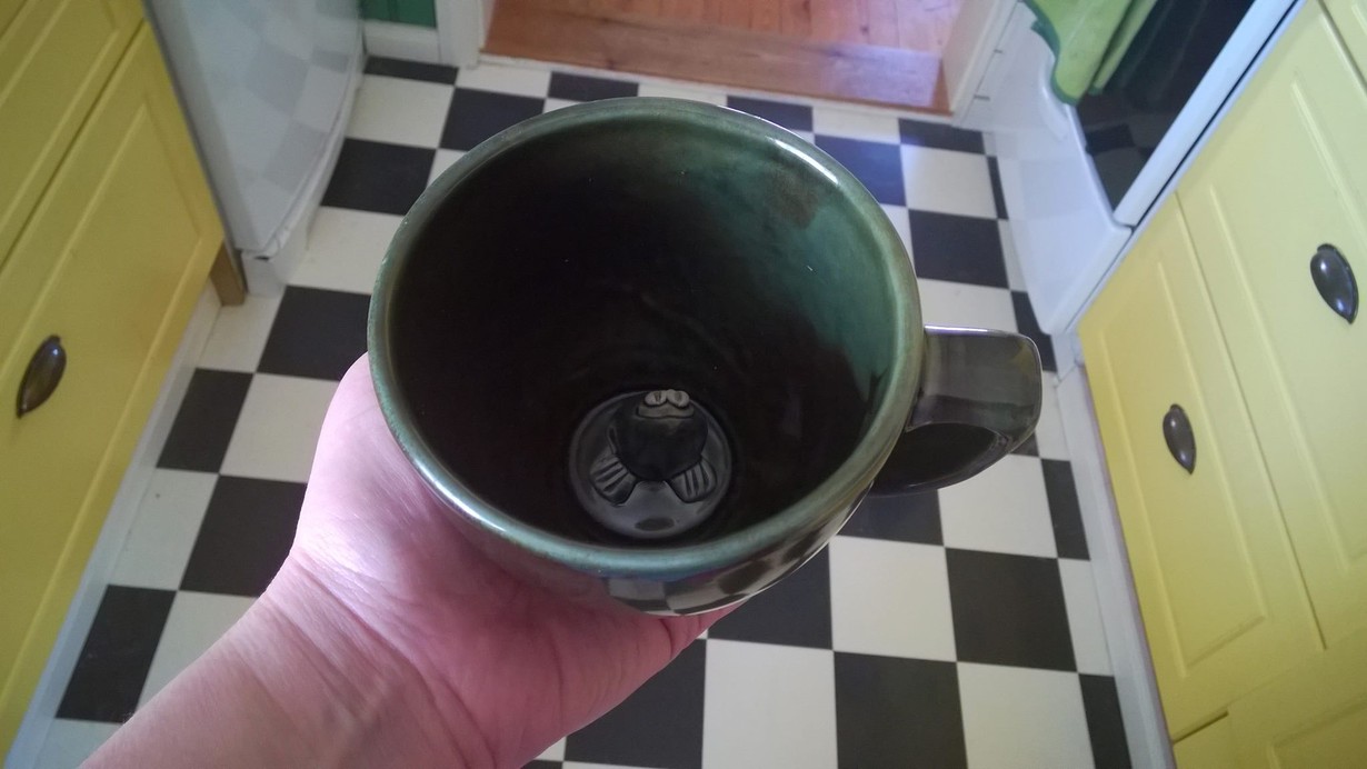 Monta hauskaa hetkeä on ollut kun joku vieraani on mukista juonut ja pohjalta luuraa sammakko :D