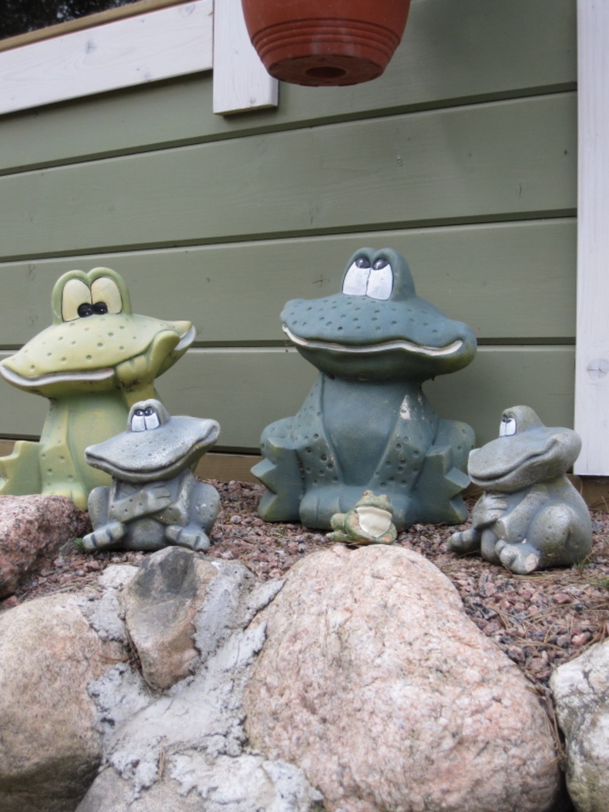 Tämä ihana arki: puutarhakoriste SAMMAKKOPERHE 30.4.2012 klo 19:41 Äitienpäivälahjaksi saatu iloinen sammakkoperhe asustelee kodan vierellä.