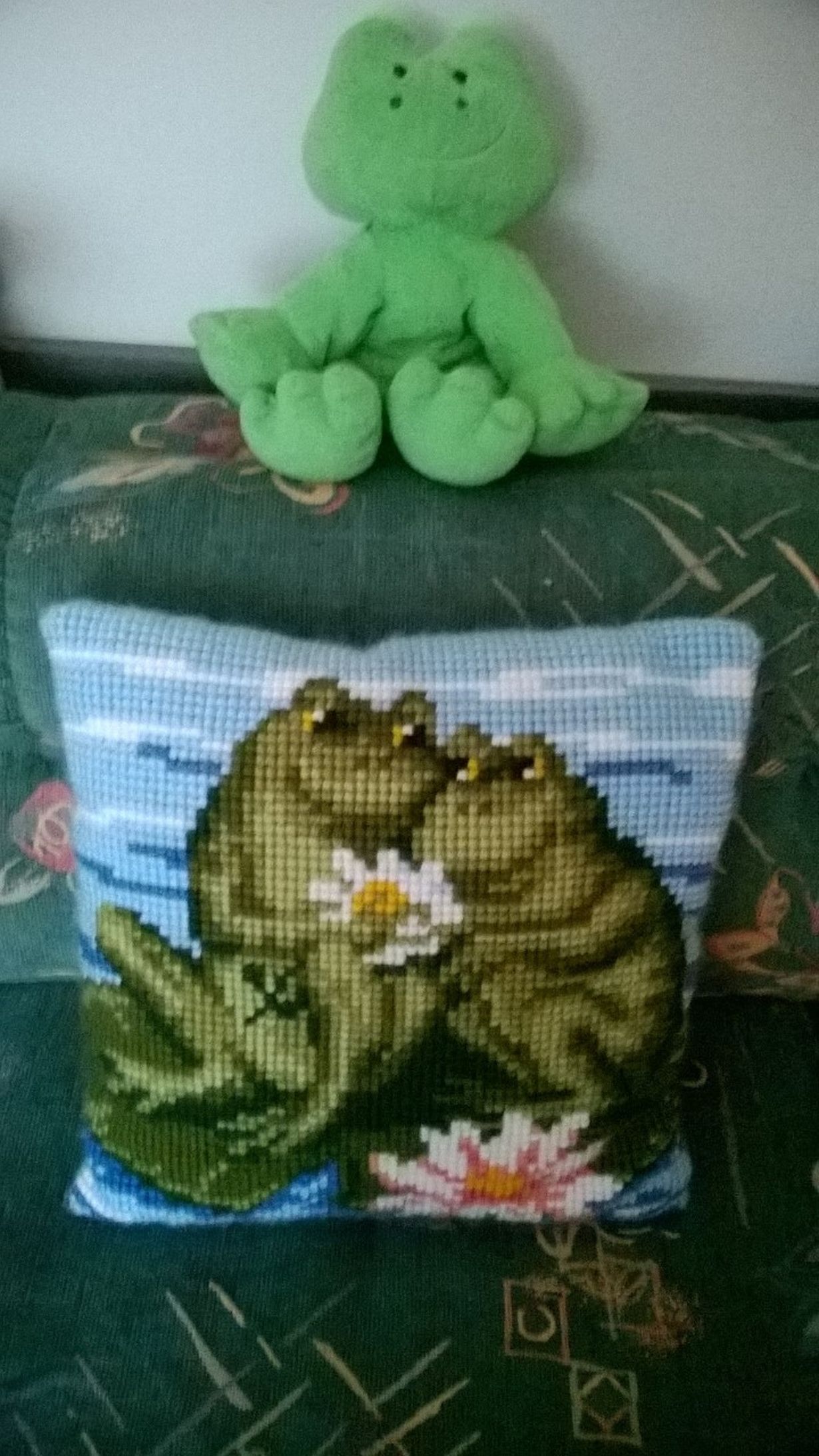 Muutama vuosi sitten olin innostunut keräilemään erilaisia sammakoita ja tämähän ei ollut jäänyt "jälkikasvulta" huomaamatta. Äitienpäivälahjaksi sain sinä vuonna tämän tyttären ompeleman sohvatyynyn. Ihana lahja!
