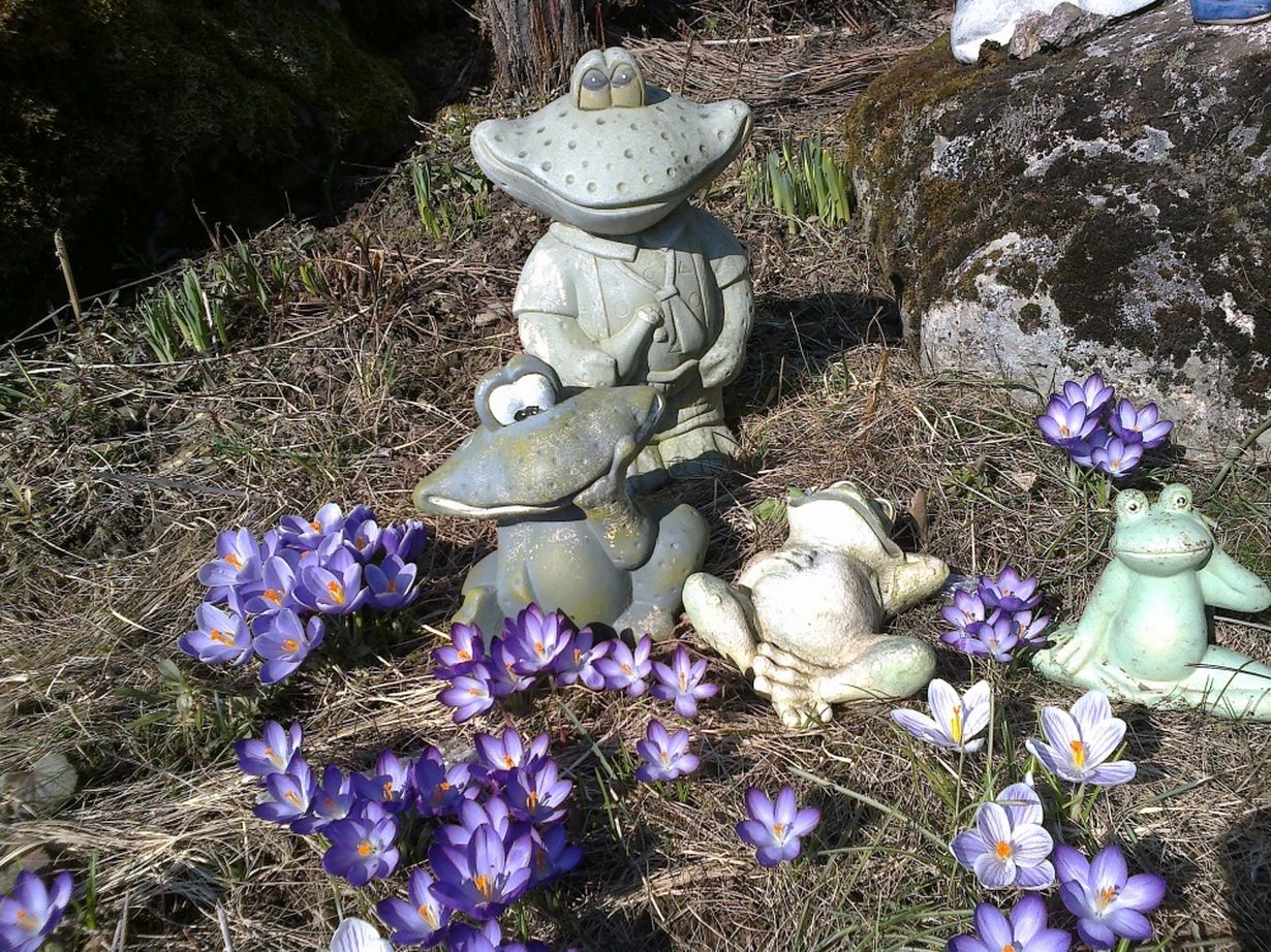 Sammakoita olen keräillyt suihkulähteeni ympäristöön. Lapsetkin keräilevät niitä. Lämpöisenä päivänä laitoin niitä Krookusten sekaan, kun kukat olivat oikein auki.Kevät oli tullut.